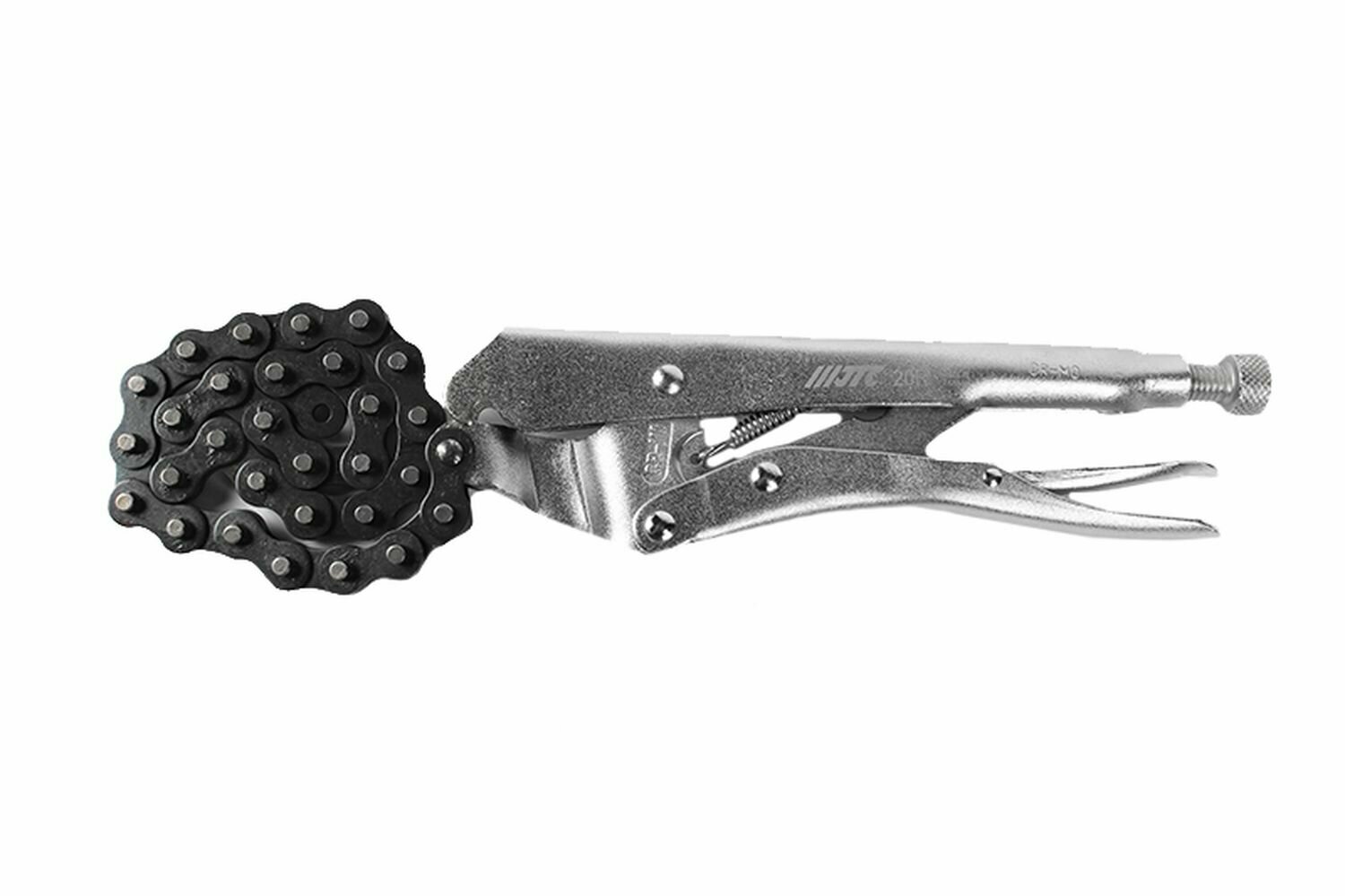 Съемник фильтра цепной JTC обладает эргономичной конструкцией, что позволяет использовать его для демонтажа различных деталей и элементов (например, крепежа) автомобиля. Инструмент обладает небольшими размерами и малым весом, его удобно держать в руке, хранить, а также транспортировать. Регулируемая по длине цепь (до 483 мм) обеспечивает надежный захват снимаемого элемента. Никелированное покрытие защищает изделие от коррозии. Материал зажима - закаленная хром-молибденовая сталь. Тип - цепь Материал губок - CrMo Материал рукояток - CrMo Материал рамы - сталь Длина - 508 мм