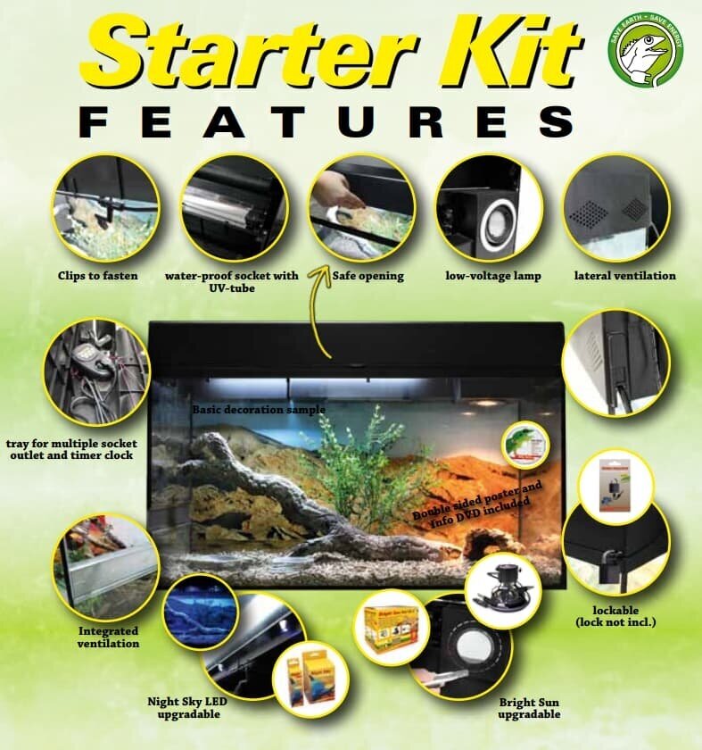 Полностью оборудованный стеклянный террариум для бородатых агам, белый, 80×40×52 см.Стартовый набор Lucky Reptile Starter Kit Bearded Dragon для бородатых агам представляет собой комплект всего необходимого для обустройства жилища своему питомцу. Правильно подобранные и сочетаемые друг с другом компоненты подходят для моделирования необходимой среды обитания. В данном случае он подходит для постоянного заселения нескольких молодых особей или одну взрослую длиной до 25 см. Комплект состоит из террариума, оснащённого проточной вентиляцией и крышкой. Крышку можно открывать, что делает процесс уборки и кормления более удобным. Она оснащена креплениями для систем осадков. Здесь же находится полость для хранения кабелей, шлангов.Освещение и обогрев обеспечиваются УФ-лампой Т5 (для получения необходимого количества ультрафиолета) и галогенной лампой (для получения тепла). В качестве почвенного наполнителя используется натуральный субстрат Cannabis Bedding. Дополнительно в наборе находятся декоративные элементы, кормушка-поилка из синтетической смолы с небольшим пандусом для удобства доступа к чаше, кормушка для еды, задний фон двусторонний с фотографиями пустынной местности. Все элементы уникальны для каждого набора, поэтому изображения могут не соответствовать реальным комплектующим.Стартовые наборы Lucky Reptile Starter Kit актуальны для разведения животных в качестве хобби для тех, кто еще не сталкивался с миром террариумов, и доступны в белом и черном цветах.Параметры:Размер 80×40×52 см, цвет — белый, имеются отверстия в крышке для крепления лампы, систем осадков.Комплектация:Субстрат Lucky Reptile Cannabis Bedding 4 л, фон двусторонний, декоративные украшения, лампа Lucky Reptile UV Sun T5 24 Вт, Lucky Reptile Halogen Sun LV 35 Вт, кормушка Food Dish Lava средняя, поилка-кормушка Lucky Reptile Dish Lava средняя, брошюра, инструкция в картонной коробке.