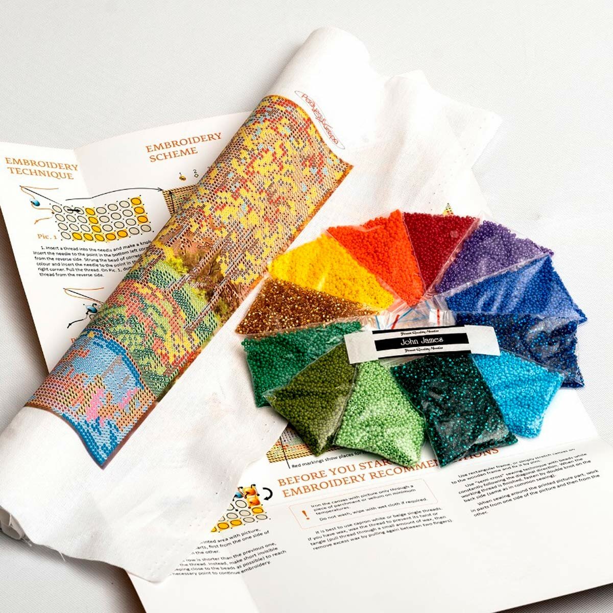 | В набор входит | канва (лен) с рисунком, бисер Ornela (21 цветов), игла James John, нитки для пришивания, инструкция |