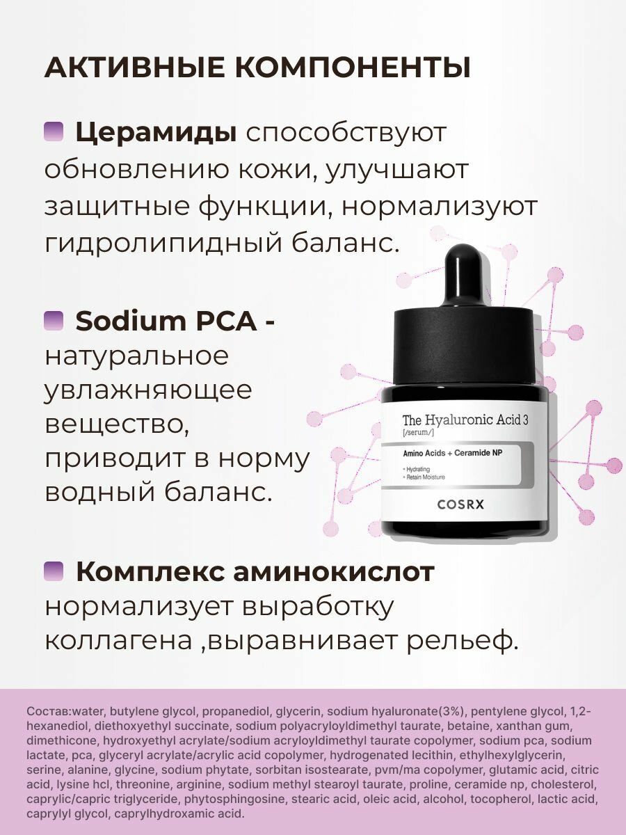 | Состав | Water, Butylene Glycol, Propanediol, Glycerin, Sodium Hyaluronate(3%), Pentylene Glycol, 1,2-Hexanediol, Diethoxyethyl Succinate, Sodium Polyacryloyldimethyl Taurate, Betaine, Xanthan Gum, Dimethicone, Hydroxyethyl Acrylate/Sodium Acryloyldimethyl Taurate Copolymer, Sodium PCA, Sodium Lactate, PCA, Glyceryl Acrylate/Acrylic Acid Copolymer, Hydrogenated Lecithin, Ethylhexylglycerin, Serine, Alanine, Glycine, Sodium Phytate, Sorbitan Isostearate, PVM/MA Copolymer, Glutamic Acid, Citric Acid, Lysine HCl, Threonine, Arginine, Sodium Methyl Stearoyl Taurate, Proline, Ceramide NP, Cholesterol, Caprylic/Capric Triglyceride, Phytosphingosine, Stearic Acid, Oleic Acid, Alcohol, Tocopherol, Lactic Acid, Caprylyl Glycol, Caprylhydroxamic Acid |