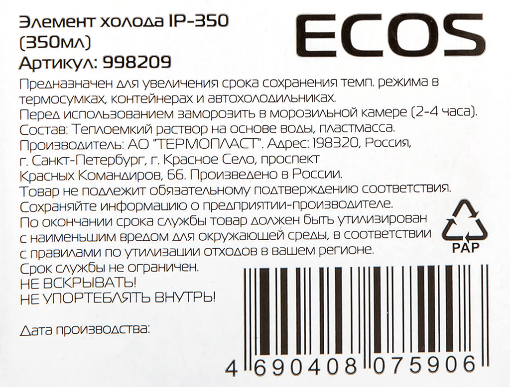 Элемент холода (350мл) (для изотермических сумок) Герметично упакован, не токсичен. Материал: Полимерные материалы, теплоемкий раствор на основе воды. Объем: 350 мл Назначение: предназначен для хранения и транспортировки скоропортящихся продуктов, охлаждению напитков в изотермических контейнерах, термобоксах, термосумках. Для любого поддержания низкой температуры. Правила использования: перед использованием поместить в морозильную камеру до желаемой степени охлаждения. Элемент холода при полном замерзании сохраняет эффективность в течении 12 часов. Меры предосторожности: не оставлять на солнце, при прямых солнечных лучах. Очищать элемент допускается в легком мыльном растворе, без использования образивных средств.