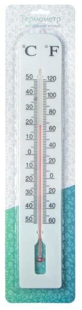 Уличный фасадный термометр, устанавливается на фасад здания. Отображает температуру воздуха на улице. Выполнен из белого пластика. Увеличенный размер термометра. Крупные цифры шкалы видны с большого расстояния. Диапазон температуры от -50 C до +50 градусов. Цена деления 1 C.