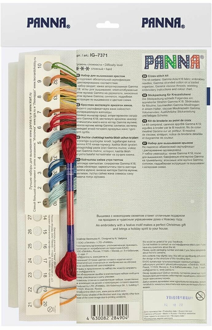 | В набор входит | канва Aida 18 белого цвета, мулине, игла, цветная символьная схема, инструкция, синтепон |