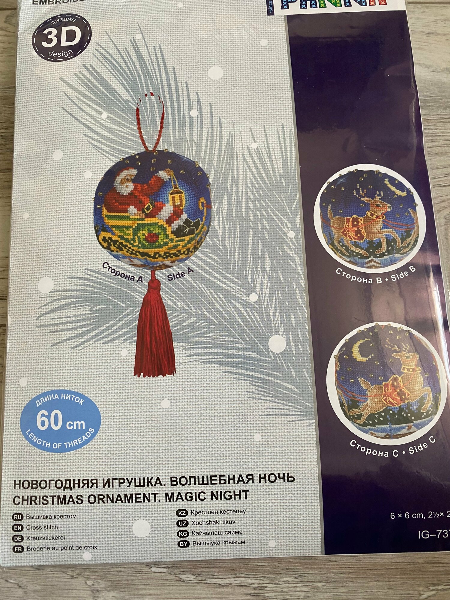 В набор для вышивания PANNA входит: аппертированная канва Gamma Aida 18, хлопчатобумажные нитки мулине Gamma, вискозные нитки мулине Gamma, бисер, игла для вышивания Gamma, синтепон для набивки шара, цветная схема, инструкция по вышиванию и сшиванию игрушки. Размер готовой работы: 6 х 6 см. Особенность набора - 3D-дизайн. Вышивка с новогодним сюжетом станет отличным подарком на праздник и чудесным украшением дома к Новому году.