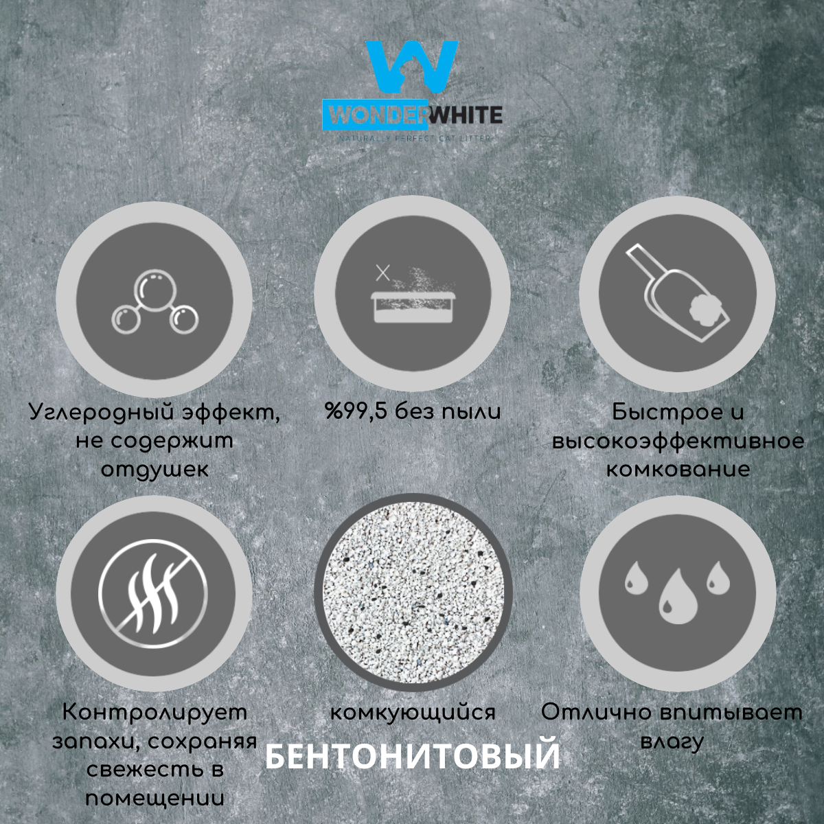 В составе белого бентонита черный природный уголь – природный абсорбент, придает наполнителю 2-ой контроль борьбы с неприятными запахами и идеальный прочный комок.
