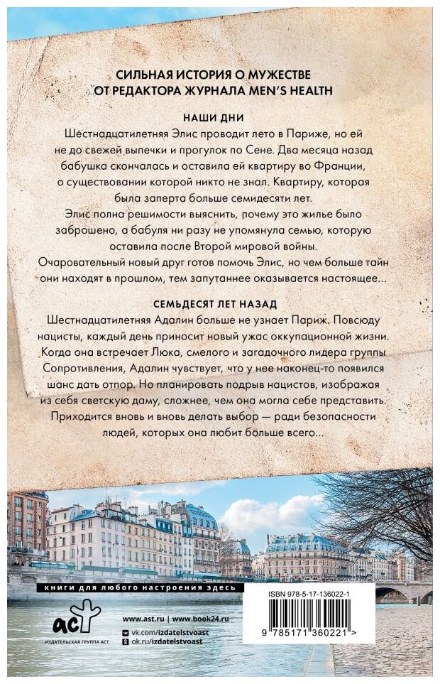 Шестнадцатилетняя Адалин больше не узнает Париж. Повсюду нацисты, каждый день приносит новый ужас оккупационной жизни. Когда она встречает Люка, смелого и загадочного лидера группы Cопротивления, Адалин чувствует, что у нее наконец-то появился шанс дать отпор. Но планировать подрыв нацистов, изображая из себя светскую даму, сложнее, чем она могла себе представить. Приходится вновь и вновь делать выбор - ради безопасности людей, которых она любит больше всего…
