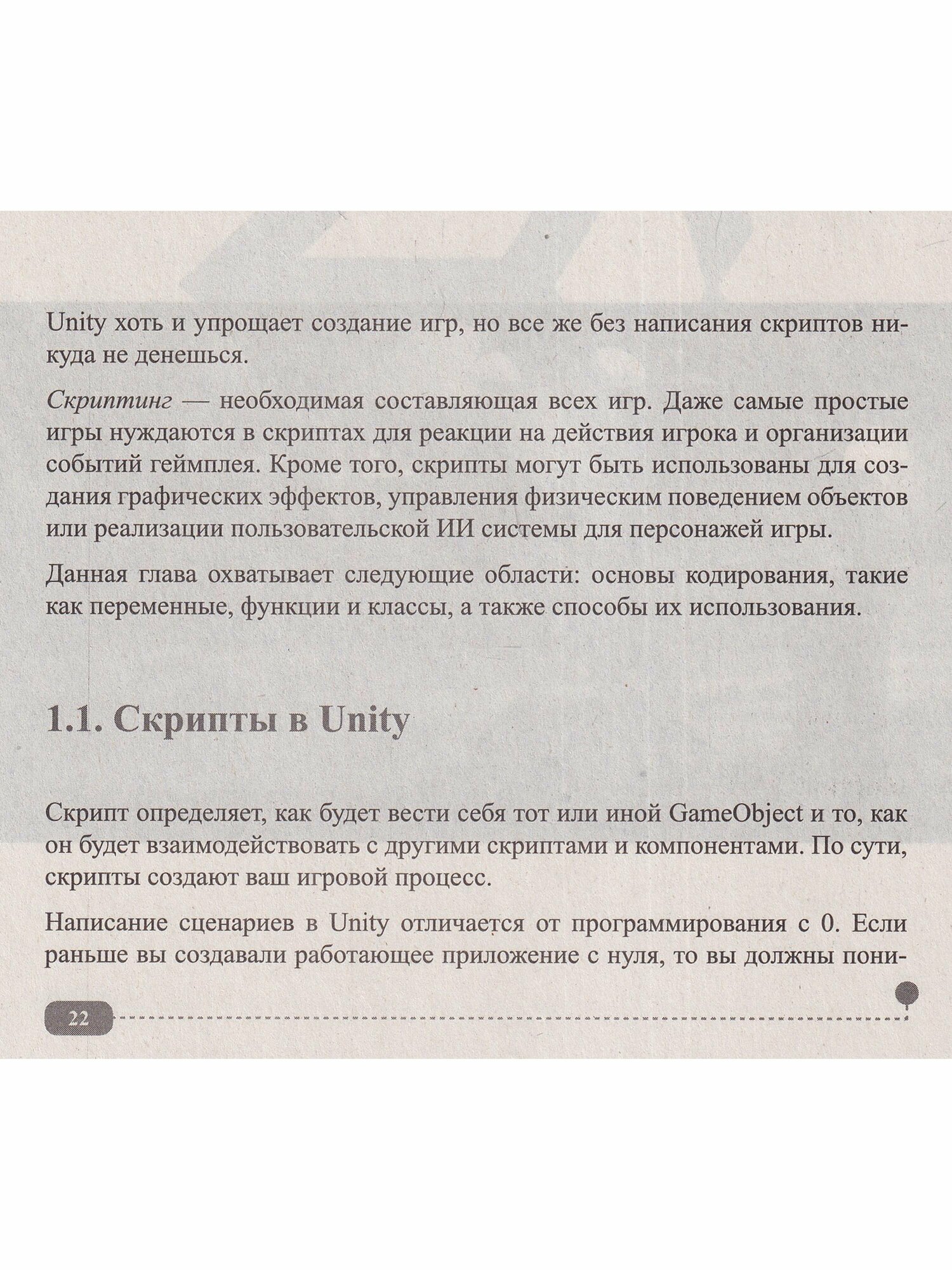 Для достижения этих целей в книге вы найдете большое количество необходимой информации - будут рассмотрены основы скриптинга, интерактивный ввод, классы игровых объектов, создание инвентаря, программирование AI вражеских объектов, создание уровней в Unity и многое другое. Отдельное внимание будет уделено сохранению и загрузке данных, подготовке счета и достижений в игре, а также программированию анимации.