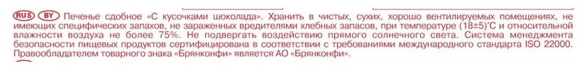 | Состав | Мука пшеничная; маргарин (рафинированные дезодорированные растительные масла в натуральном и модифицированном виде, вода питьевая, эмульгаторы (Е471, Е475), соль, ароматизатор «Сливки-молоко», краситель «Каротины», регулятор кислотности лимонная кислота); сахар; вода питьевая; шоколадная масса (сахар, тёртое какао, масло какао, эмульгатор лецитин соевый, ароматизатор «Ванилин»); инвертный сироп (сахар, регуляторы кислотности: гидрокарбонат натрия (сода пищевая), лимонная кислота); сыворотка молочная сухая; разрыхлители: карбонат аммония, гидрокарбонат натрия (сода пищевая); соль; эмульгатор лецитин соевый; ароматизатор «Ваниль». |