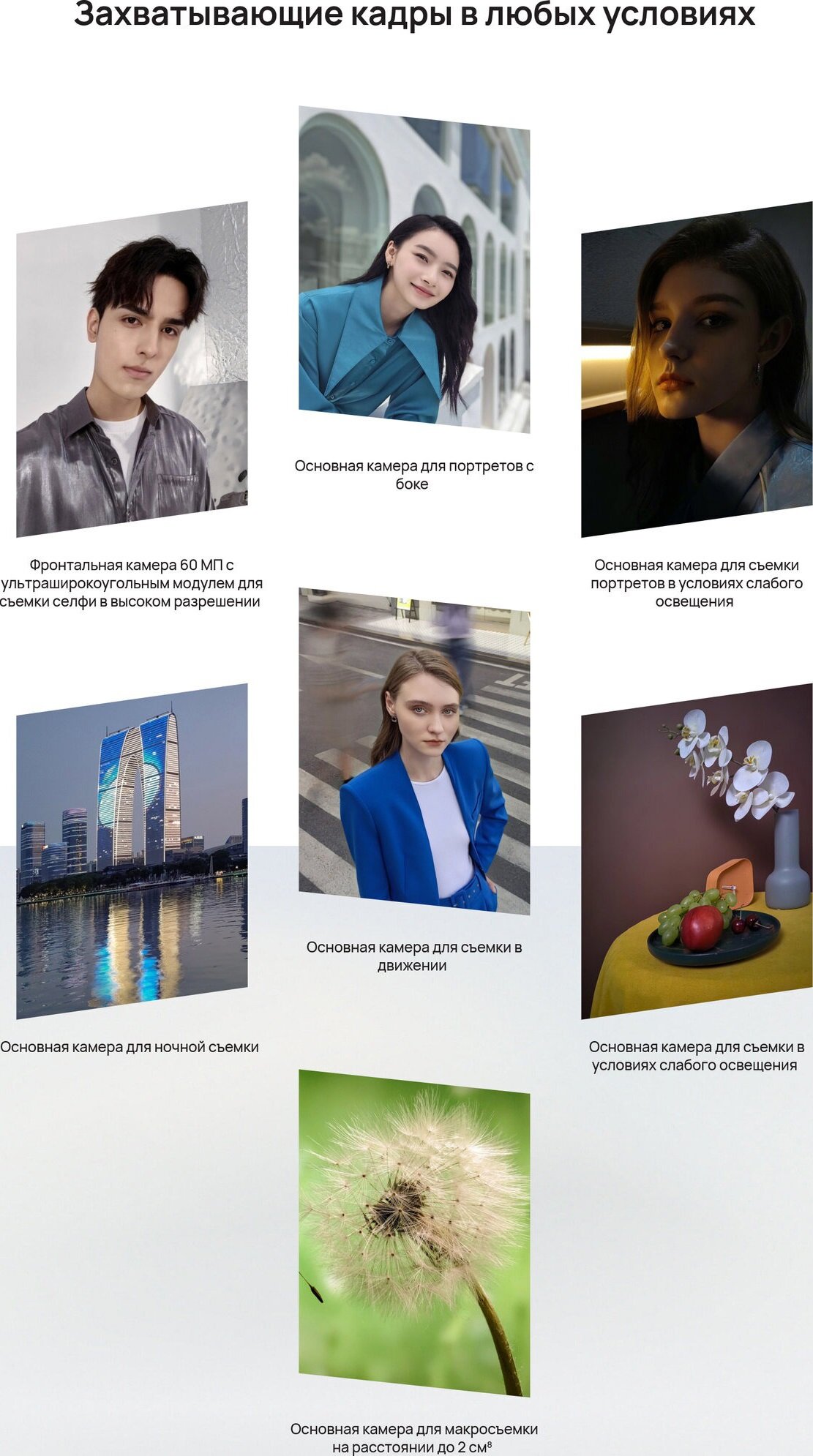 Запечатлейте яркие мгновения вашей жизни на ультраширокоугольную фронтальную камеру 60 МП1. А камера Ultra Vision 50 МП RYYB3 позволит сделать незабываемые снимки. Благодаря массиву цветовых фильтров Huawei RYYB, которые улавливают на 40% больше света по сравнению с другими камерами, в которых используется массив RGGB6, ваши снимки будут яркими и насыщенными.