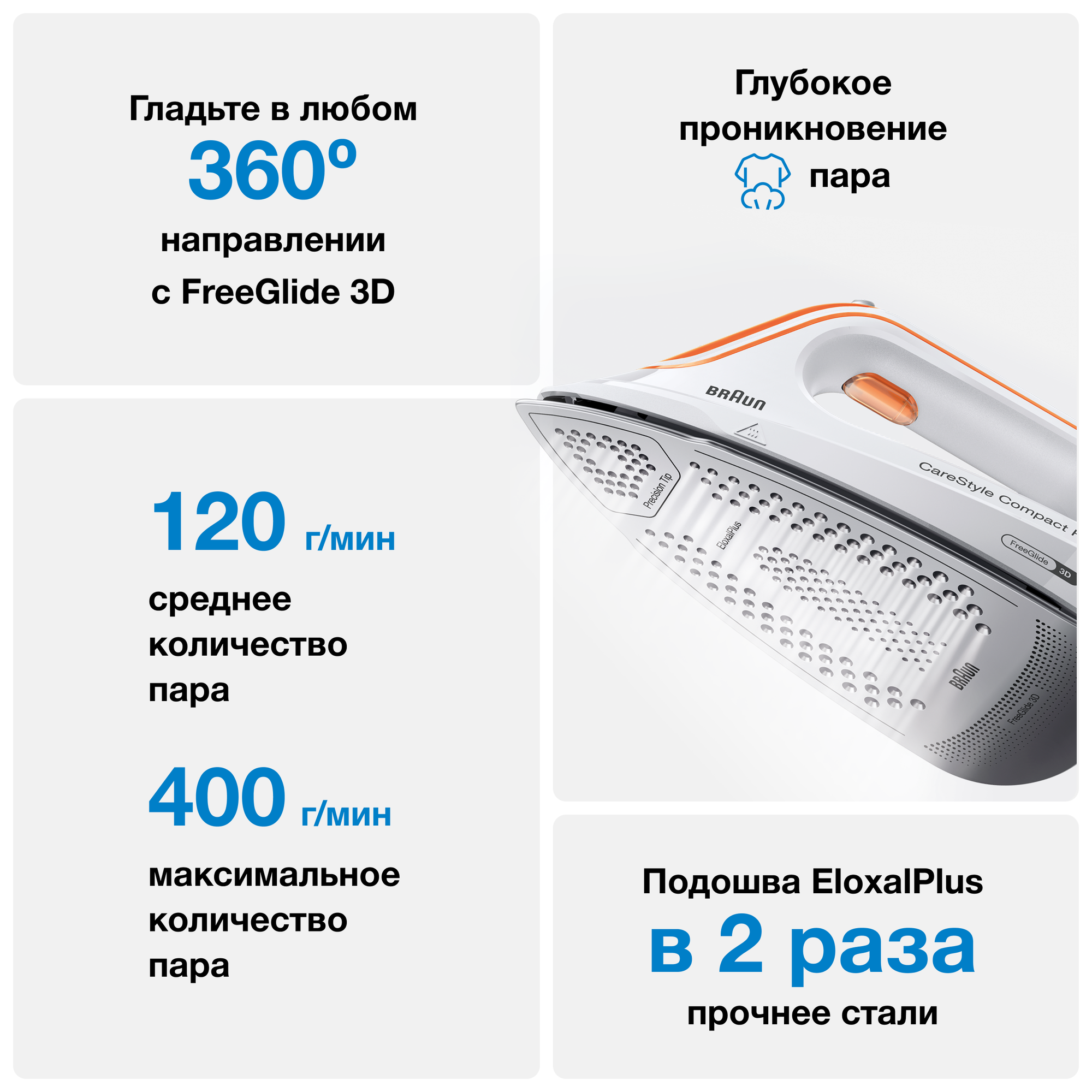 | Дополнительные функции | противокапельная система, постоянная подача пара, паровой удар, функция самоочистки от накипи |
