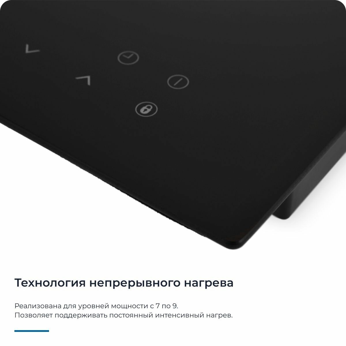 Преимущество данной варочной панели заключается в ее интеллектуальном выборе мощности конфорок. Благодаря этому вы всегда сможете экономить электроэнергию и уверенно контролировать процесс готовки.