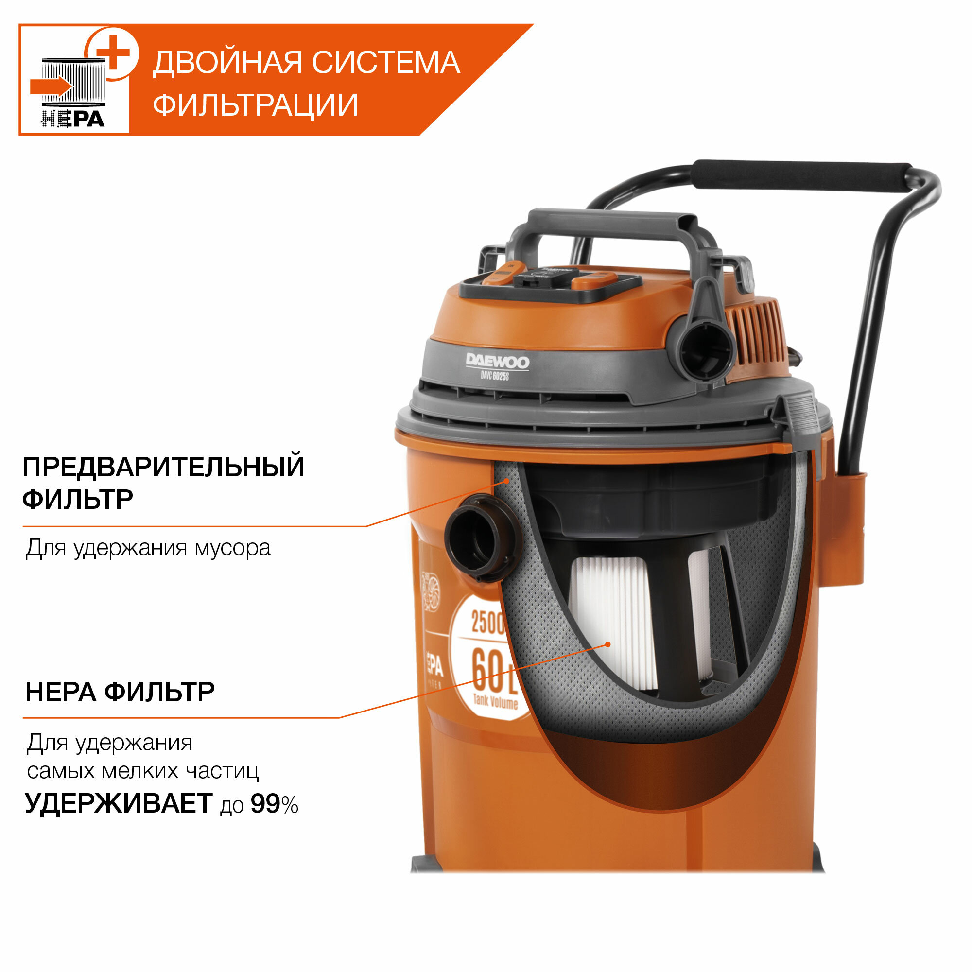 Промышленный пылесос Daewoo DAVC 6025S специально разработан и предназначен для сухой и влажной уборки помещений, сбора любой сухой пыли, мокрой грязи и твердых частиц. Оборудован системой автоматического включения и отключения при одновременном использовании с электроинструментом для принудительного удаления продуктов пиления, строгания, фрезерования и т.п.Преимущества Турборежим до 2500 Вт. Пылесос оснащен двумя турбинами соединенными напрямую с двумя электромоторами Бак из ударопрочного пластика. Объем бака 60 л Корпус пылесоса выполнен из современного, ударопрочного пластика с толщиной стенки 4 мм Стойкий к механическим воздействиям и коррозии Двойная система фильтрации HEPA+. HEPA+ (High Efficiency Particulate Air) – высокоэффективная система фильтрации воздуха состоит из 2-х частей: предварительный фильтр для удержания цементной пыли и HEPA фильтр, для удержания самых мелких частиц Розетка для электроинструмента. Встроенная розетка позволяет подключать к нему электроинструменты мощностью до 1 кВт Автоматическое включение пылесоса при начале использования инструмента и отключение с задержкой для удаления грязи из шланга Возможность сбора воды. Функция всасывания и откачки воды позволяет эффективно собирать жидкость с любого покрытия в объеме до 40 - 43 литров Автоматическая остановка всасывания для предотвращения попадания жидкости в двигатель Насадка для устранения засоров. Эффективно удаляет засоры в сливах раковин, ван и душевых кабин, без необходимости разбора и применения химикатов. Специальная форма обеспечивает высокую степень разряжения и подходит для всех типов шлангов от 32 до 38 мм Сливное дренажное отверстие. Отверстие, расположенное в нижней части бака, облегчает слив собранной загрязненной жидкости без необходимости поднимать и переворачивать пылесос Режим обратного выдувания. Функция обратного выдувания 3900 л/мин позволяет очистить рабочее место от опилок и стружки, сдуть листву с дорожек или прочистить водосток или канализацию Професеиональный шланг 38 мм. Всасывающий шланг увеличенного диаметра до 38 мм для простоты сбора больших объемов строительного мусора и пыли Увеличенная длина шланга до 5 м позволяет работать в труднодоступных местах не перемещая пылесос