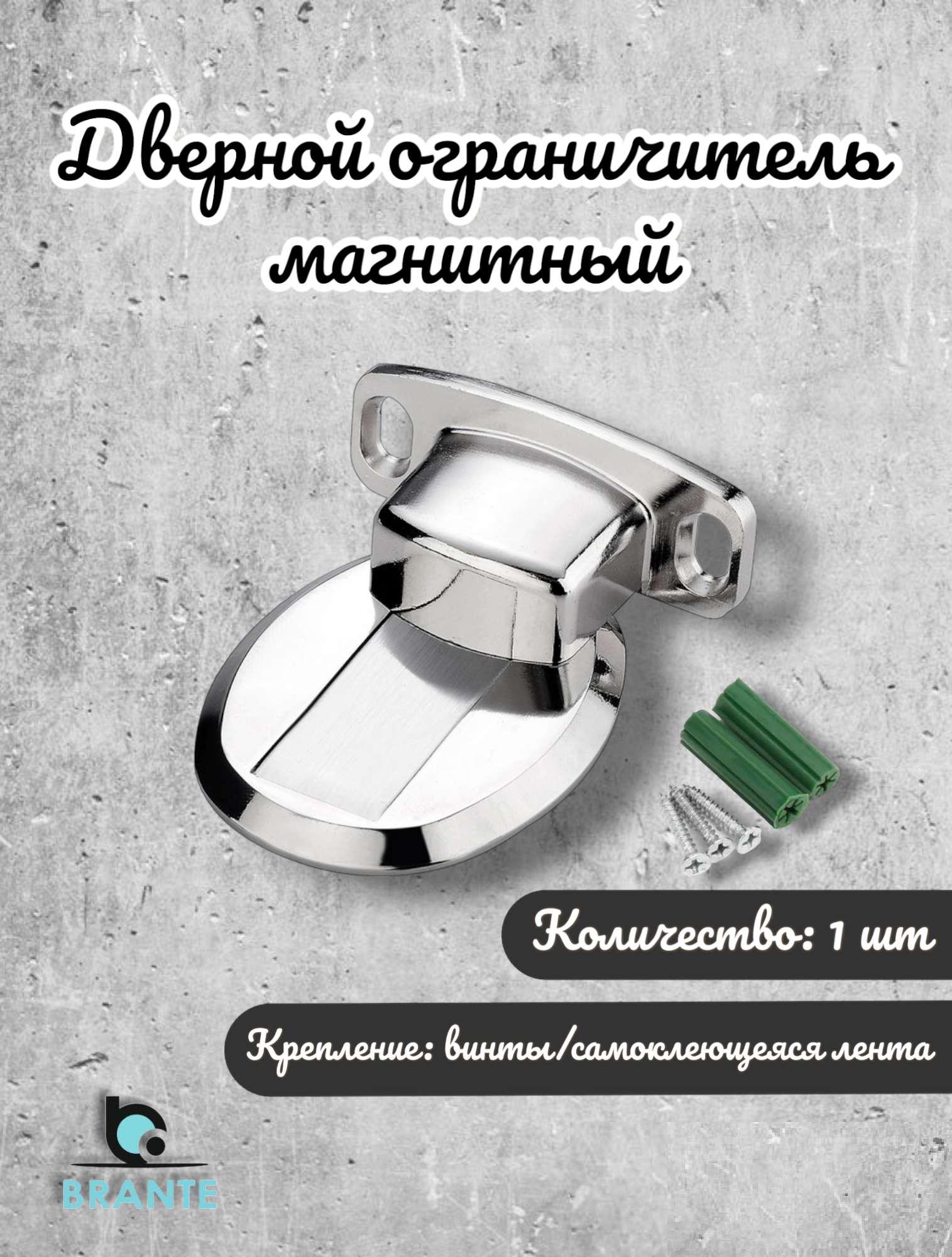 Магнитный дверной упор, можно устанавливать с помощью винтов либо самоклеющейся ленты.Дверной держатель состоит из двух частей: напольной и дверной.Магнит удерживает дверь открытой, когда вам это нужно.Дверной ограничитель – объект, задерживающий дверь в одном положении либо останавливающий дверь от выхода за допустимые границы. Применяется ради избежания повреждений покрытия стен при полном открытии дверей. Он служит в качестве стопора, не допуская соприкосновения ручек и полотна со стеной, что может привести к образованию выбоин, потертостей или вмятин на ней.К очевидным преимуществам можно отнести:Простота монтирования: Любой фиксатор несложно установить.Наш магазин - единственный и уникальный поставщик бренда BRANTE на рынке. Торговая марка была официально зарегистрирована еще в 2011 году компанией Прана. С тех пор покупатели из России и стран СНГ имеют возможность недорого приобрести надежные колеса, защелки, ручки, мебельные крючки, а также оконную фурнитуру.ограничители для дверей, стоппер для двери, ограничитель двери, стоппер, ограничитель для двери. ограничитель для двери; стоппер для двери; стопор для двери; магнит для двери; фиксатор двери; фиксатор для двери; ограничитель для двери настенный; упор для двери; ограничитель двери; стопперы для дверей; отбойник для двери; магнит на дверь; стопер для двери; стопер для двери; держатель двери; держатель для двери; ограничитель для двери от детей; упор дверной; фиксатор для двери от детей; фиксаторы для дверей; ограничитель дверей; фиксатор дверной