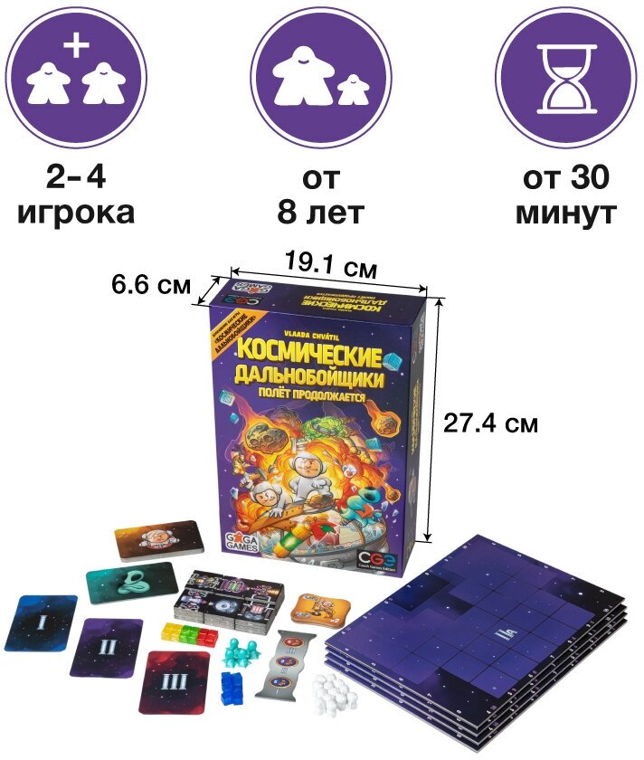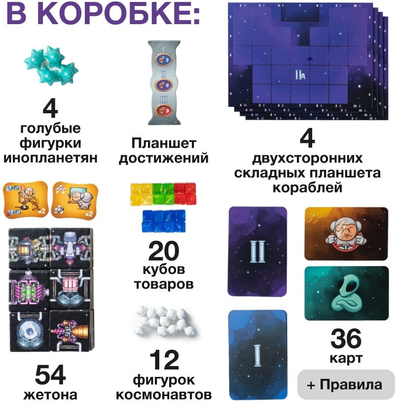 | Комплектация | 4 двухсторонних складных планшета кораблей • 52 жетона корабельных модулей • 2 жетона достижений дальнобойщиков • главный док • 9 карт приключений • 6 карт голубых инопланетян • 4 голубые фигурки инопланетян • 21 карта происшествий • 12 фигурок космонавтов • 20 кубов товаров • правила |