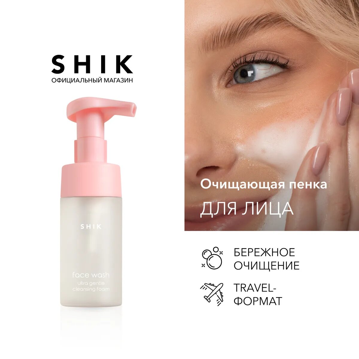 | Способ применения | нанесите небольшое количество пенки на влажную кожу лица, распределите массажными движениями, смойте водой, далее используйте следующие шаги системы ухода за кожей от shik, результат |