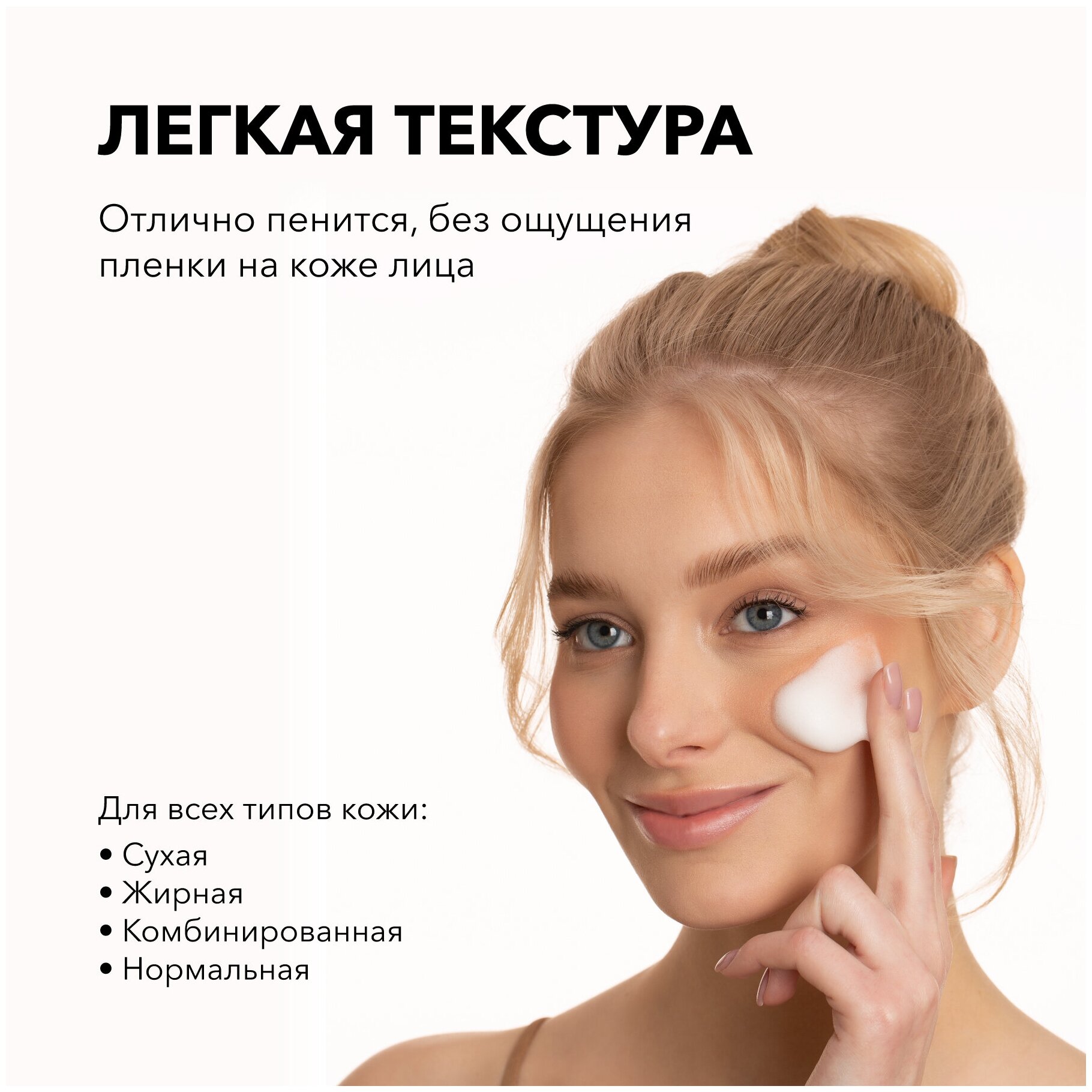 Пена для умывания лица подходит для всех типов кожи — комбинированной, жирной, нормальной, проблемной и сухой.