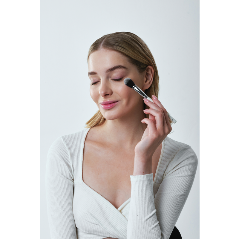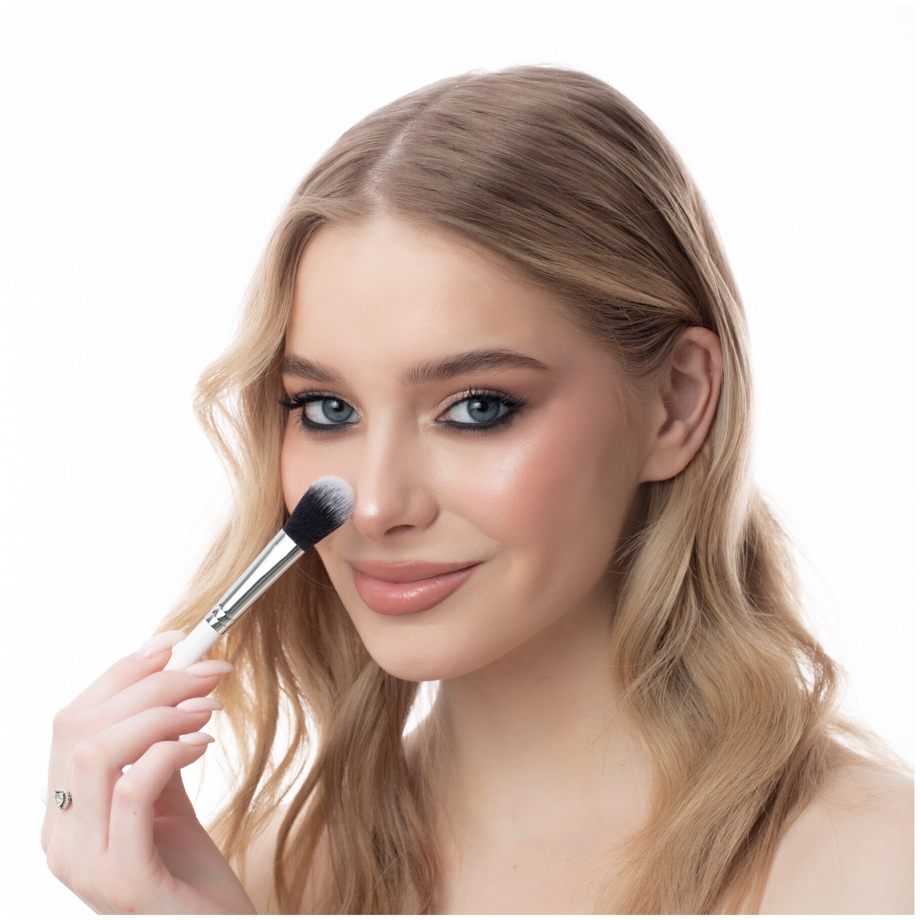Компактная универсальная кисть для идеального нанесения любых сухих и кремовых текстур: хайлайтер, скульптор, пудра, румяна, тональный крем. Имеет уникальную, продуманную форму. Три рабочие поверхности: широкая и узкая сторона позволяет наносить продукты на основные зоны; тонкая торцовая часть — для проработки зоны вокруг глаз, крыльев носа.