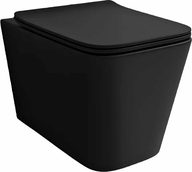 Подвесной унитаз Esbano с безободковой системой слива. Горизонтальный выпуск P-Trap. Диаметр выпуска 100мм. Межосевое крепление 180мм. Материал: фаянс. цвет: черный. Сиденье: DUROPLAST, soft-close. Плавное опускание (микролифт), быстросъемное, металлические накладки, металлический крепеж на петлях