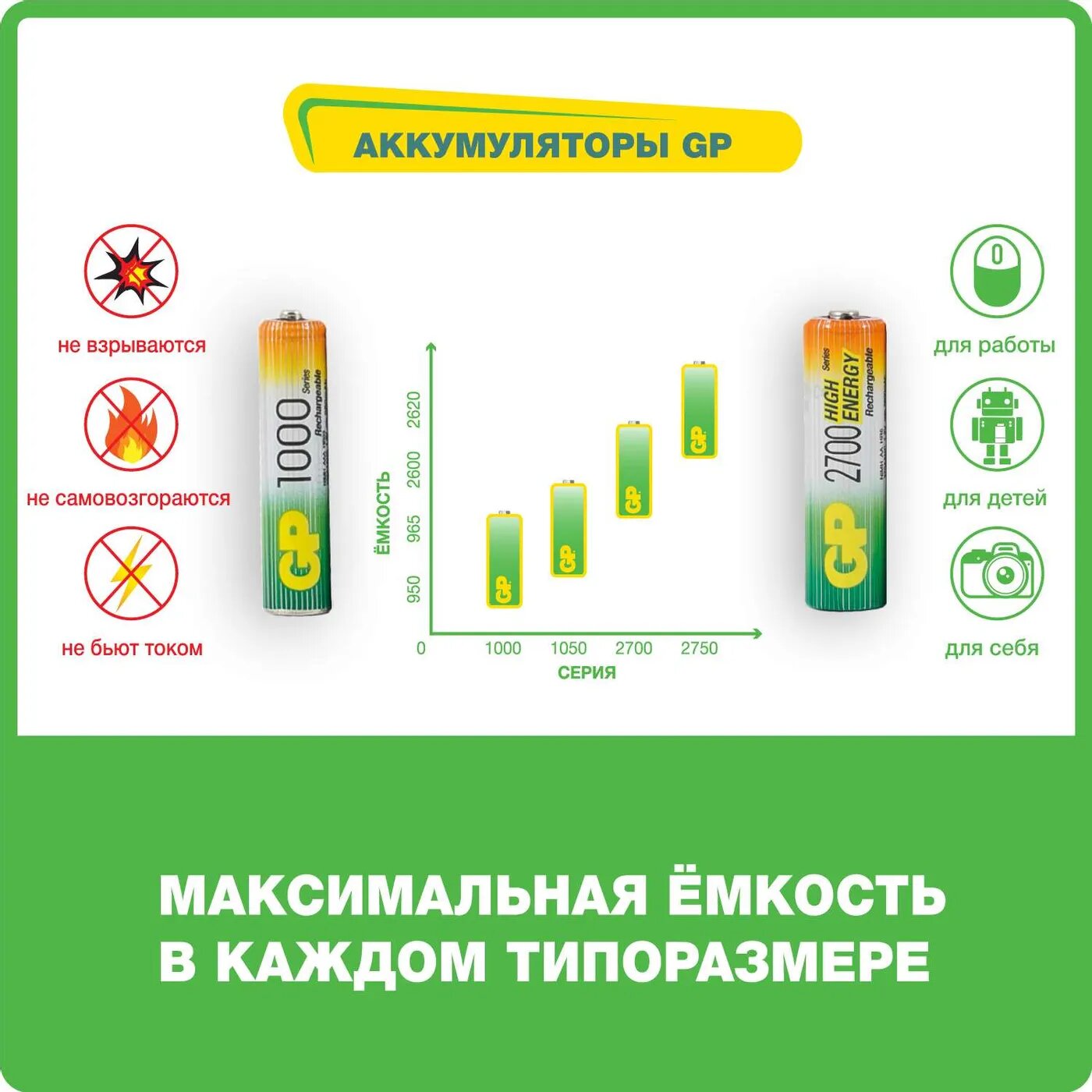 GP Batteries - долговечные, экономичные и экологичные перерабатываемые аккумуляторы. Это батареи нового поколения, обладающие высокой теплоотдачей, способные удерживать напряжение практически на одном уровне долгое время.