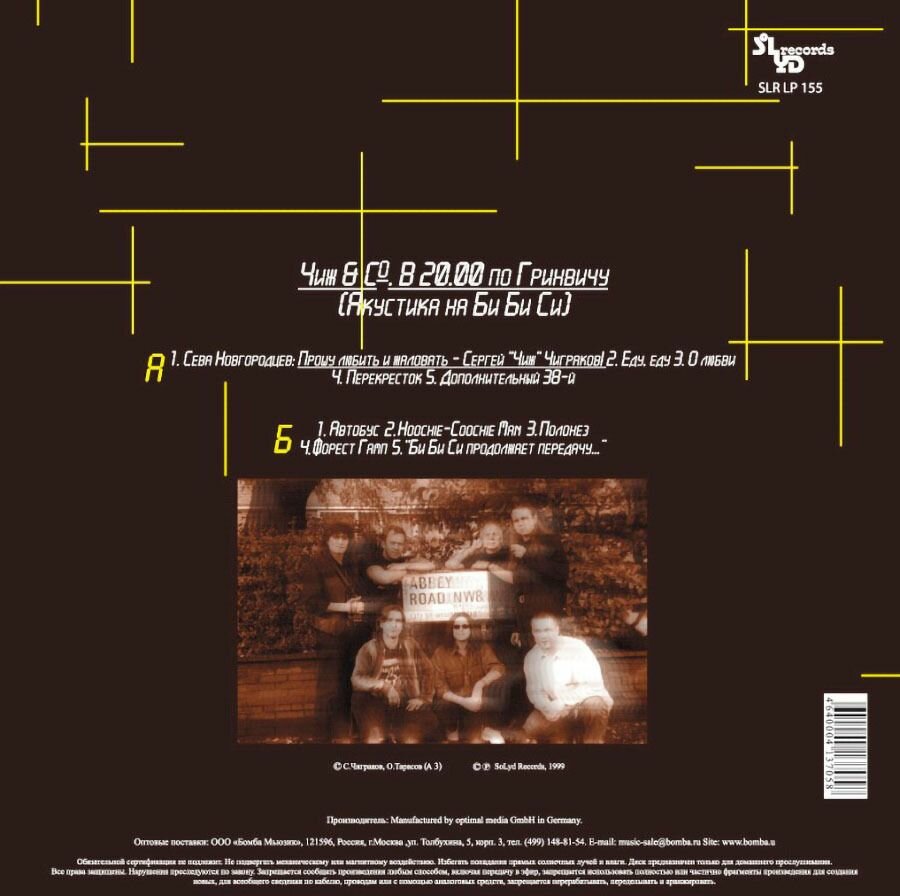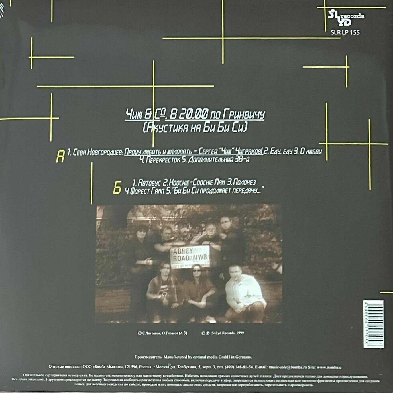 "В 20.00 По Гринвичу" - переиздание концертного альбома группы Чиж & Co, выпущенного в 1999 году. На нем представлено выступление коллектива на передаче Севы Новгородцева на ВВС в 1998 году. Издание представлено на черном виниле. Чиж & Со - российская рок-группа, созданная в начале 1990-х годов гитаристом, вокалистом и автором песен Сергеем Чиграковым по прозвищу Чиж. Последний студийный альбом группы вышел в 1999 году, а все последующие альбомы Чигракова - сольные или совместные.