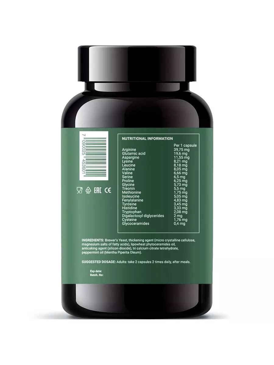 | Состав | Пивные дрожжи – 300 мг Аргинин - 39,75 мг Глутамин - 19,60 мг Аспарагин - 11,55 мг Лизин - 8,21 мг Лейцин - 8,18 мг Аланин - 8,05 мг Валин - 6,66 мг Серин - 6,50 мг Пролин - 6,25 мг Глицин - 5,73 мг Треонин - 5,50 мг Изолейцин - 5,05 мг Фенилаланин - 4,83 мг Тирозин - 3,45 мг Гистидин - 3,33 мг Триптофан - 2,08 мг Дигалактозил диглицерид - 2,00 мг Цистеин - 1,76 мг Метионин - 1,75 мг Гликоцерамиды - 0,40 мг |