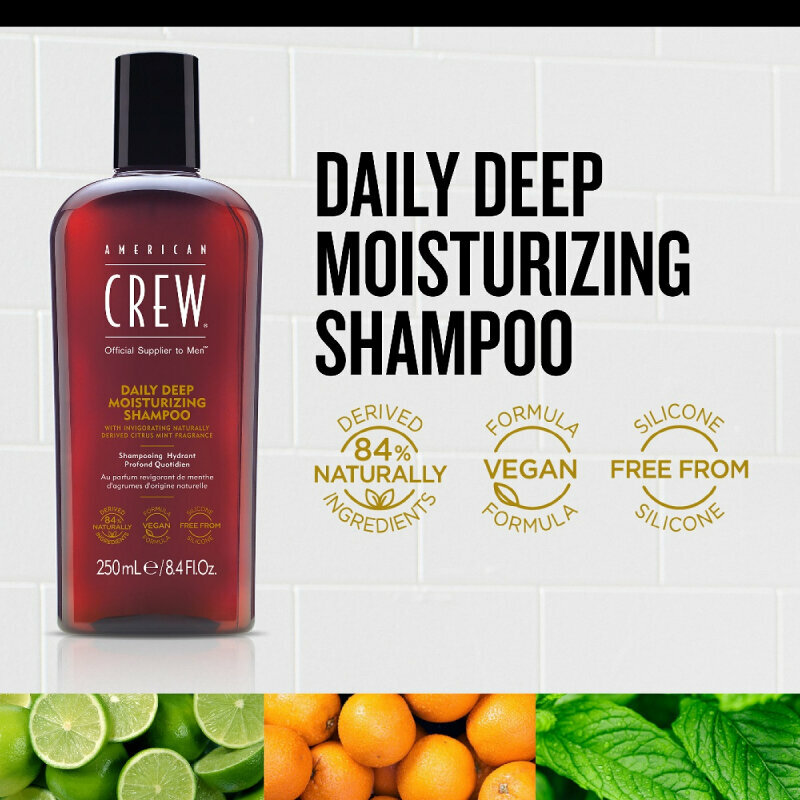 Ультраувлажняющая формула очищает, а фирменный аромат American Crew Citrus Mint заряжает энергией и бодрит. Веганский шампунь без силикона подходит для ежедневного использования на нормальных и сухих волосах.