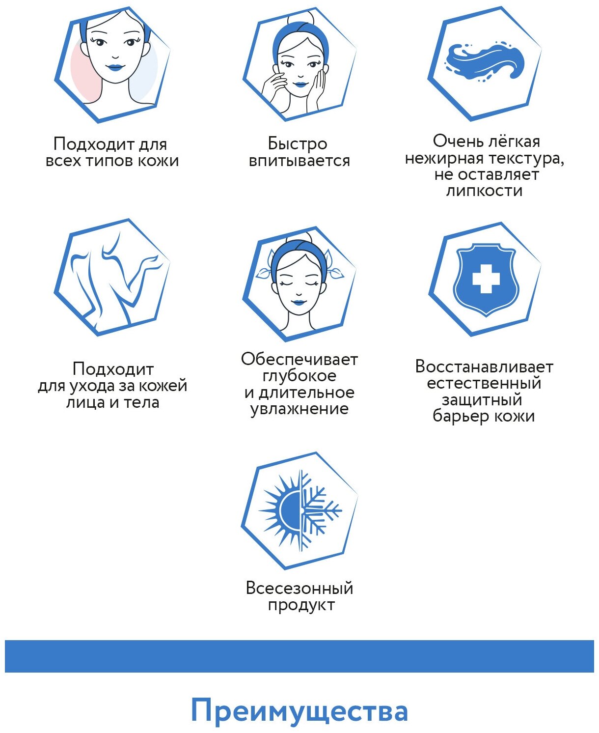Гель обеспечивает интенсивное и глубокое увлажнение кожи. Сочетание активных компонентов из растительного увлажняющего комплекса, мочевины и молочной кислоты защищает от потери влаги, улучшает внешний вид и состояние кожи, помогает восстановить сухую, зрелую и поврежденную кожу, существенно повышает ее эластичность и упругость.