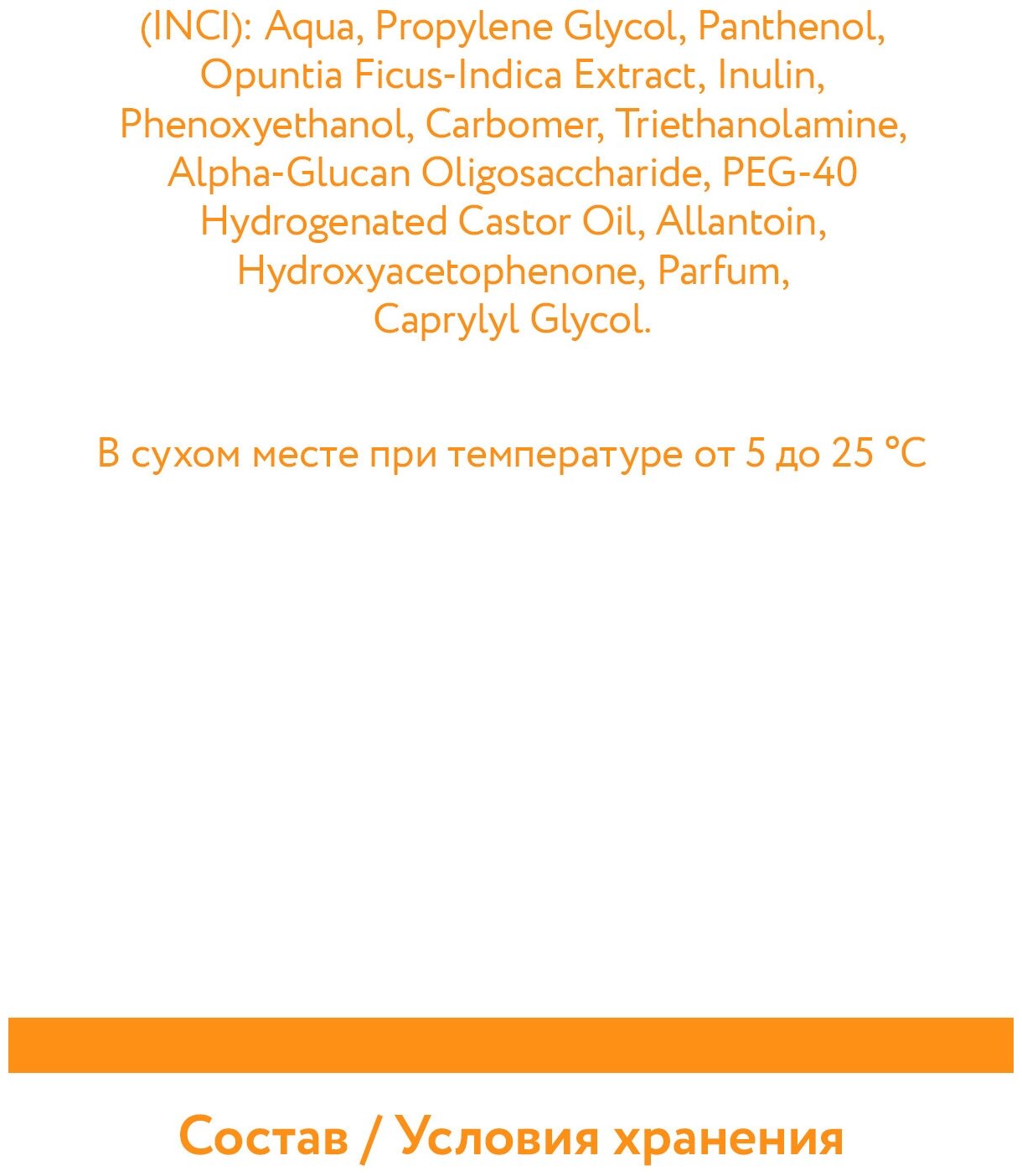 | Состав | Вода, пропиленгликоль, Д-пантенол, экстракт опунции, инулин, феноксиэтанол, карбомер, триэтаноламин, альфа-глюкан олигосахарид, ПЭГ-40 гидрогенезированное касторовое масло, аллантоин, гидроксиацетофенон, отдушка, каприлилгликоль |