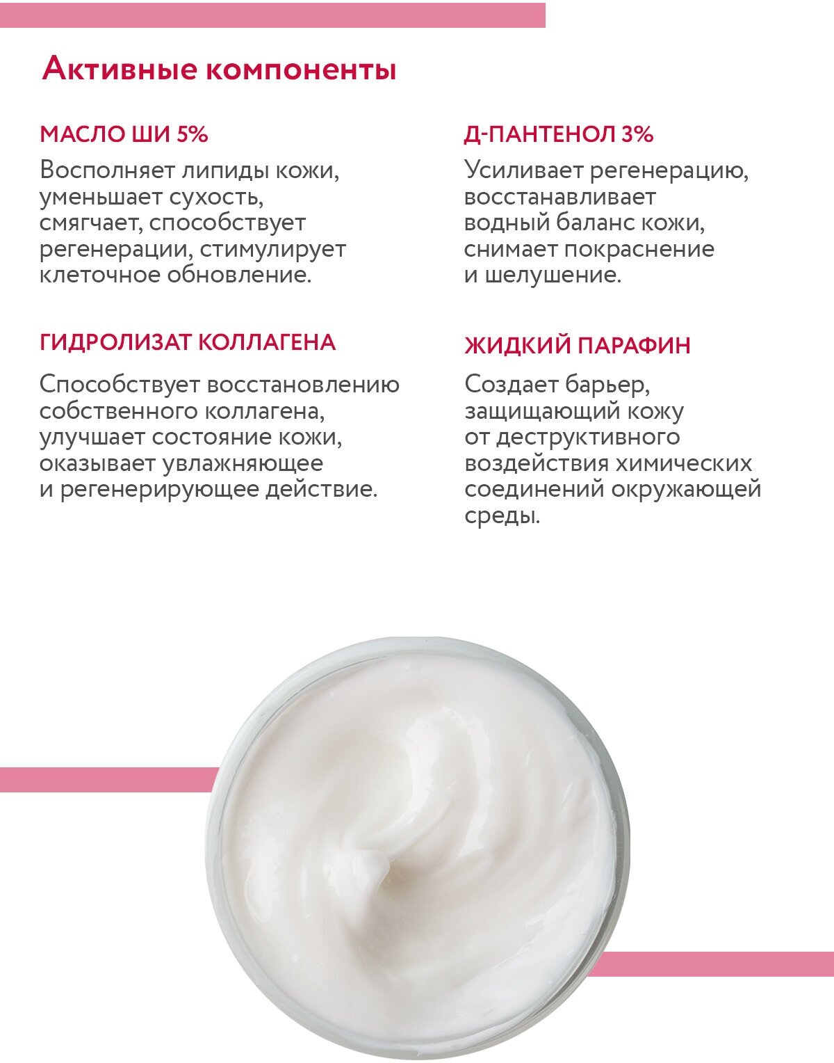 Назначение: восстановление кожи рук после частого мытья, антисептиков, дезинфекторов и пр. химических веществ, работы в перчатках, бытовых работ (стирка, уборка и т.д.), работ на производстве, медицинских организациях и косметических салонах, негативного воздействия окружающей среды.