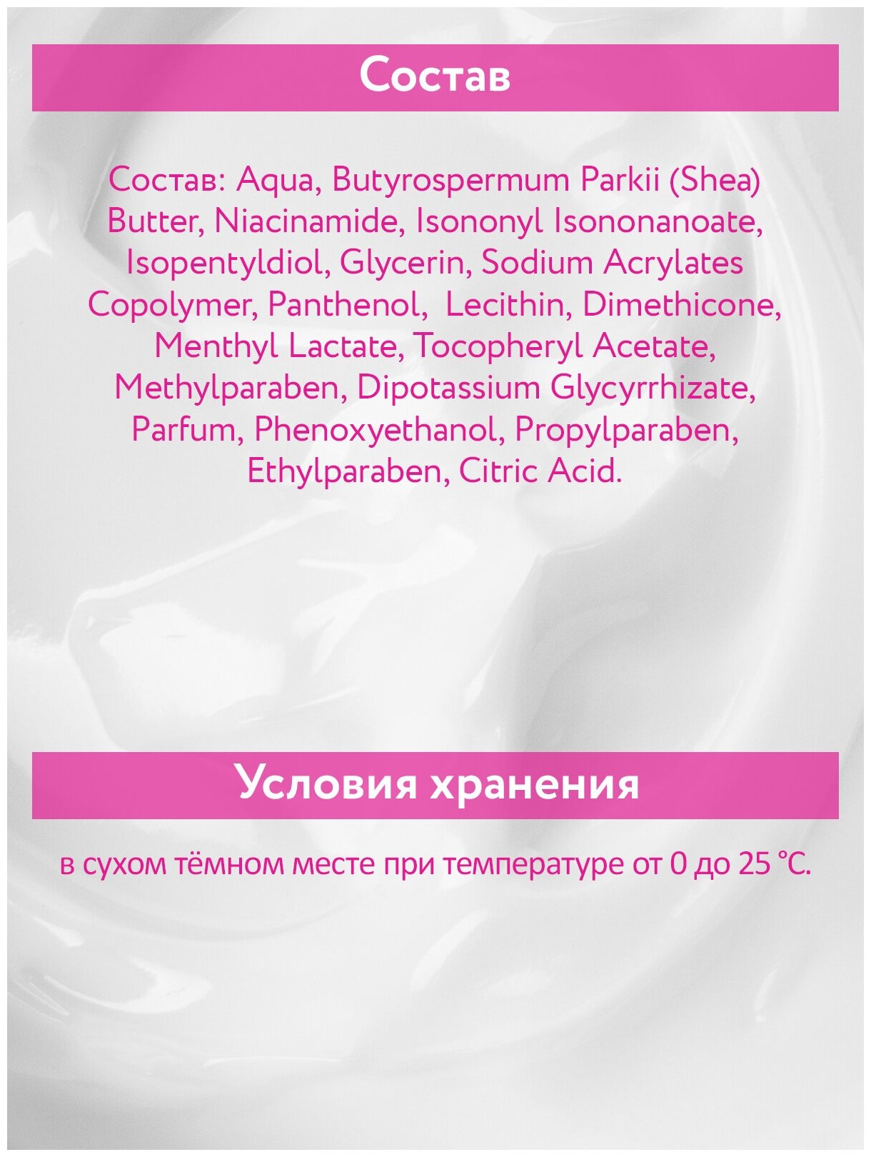 | Состав | Aqua, Butyrospermum Parkii (Shea) Butter, Niacinamide, Isononyl Isononanoate, Isopentyldiol, Glycerin, Sodium Acrylates Copolymer, Panthenol, Lecithin, Dimethicone, Menthyl Lactate, Tocopheryl Acetate, Methylparaben, Dipotassium Glycyrrhizate, Parfum, Phenoxyethanol, Propylparaben, Ethylparaben, Citric Acid. |