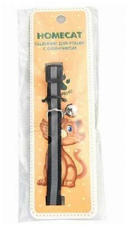 Ошейник для кошек с бубенчиком HOMECAT разработан с учётом анатомических особенностей котов и кошек. Ошейник HOMECAT это прежде всего безопасность, потому что на ошейнике есть бубенчик и светоотражающая полоса, что сделает вашего питомца более заметным. Отстёгивается ошейник одним нажантием на кнопку пластикового карабина. Длинна ошейника регулируется от 20 до 30 см.