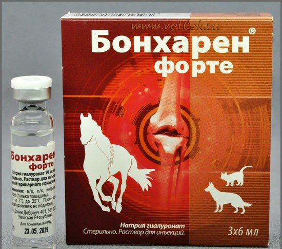 Бонхарен (Bonharen) — лекарственное средство, предназначенное для лечения артритов, артрозов и тендовагинитов неинфекционной этиологии у лошадей, собак и кошек.Бонхарен содержит в качестве действующего вещества гиалуроновую кислоту в форме гиалуроната натрия — 10 мг/мл, а в качестве вспомогательных веществ натрия хлорид и воду для инъекций.Лекарственное средство не содержит генно-инженерно-модифицированных продуктов.По внешнему виду Бонхарен представляет собой бесцветный прозрачный раствор.Действующее вещество Бонхарена — гиалуроновая кислота — является соединением природного происхождения, присутствующим в соединительной ткани, коже, стекловидном теле и в наиболее высокой концентрации в синовиальной жидкости млекопитающих. Гиалуроновая кислота нормализует клеточный состав и вязкость суставной жидкости, улучшает ее смазывающую способность, активизирует подвижность гранулоцитов и макрофагов, устраняет последствия воспалительных процессов и способствует восстановлению физиологической функции сустава.Гиалуроновая кислота при парентеральном введении в высоких концентрациях накапливается в синовиальной жидкости, где оказывает свое терапевтическое действие.Бонхарен по степени воздействия на организм относится к малоопасным веществам (4 класс опасности по ГОСТ 12.1.007-76), в рекомендуемых дозах не оказывает местнораздражающего и сенсибилизирующего действия, не обладает кумулятивными свойствами.
