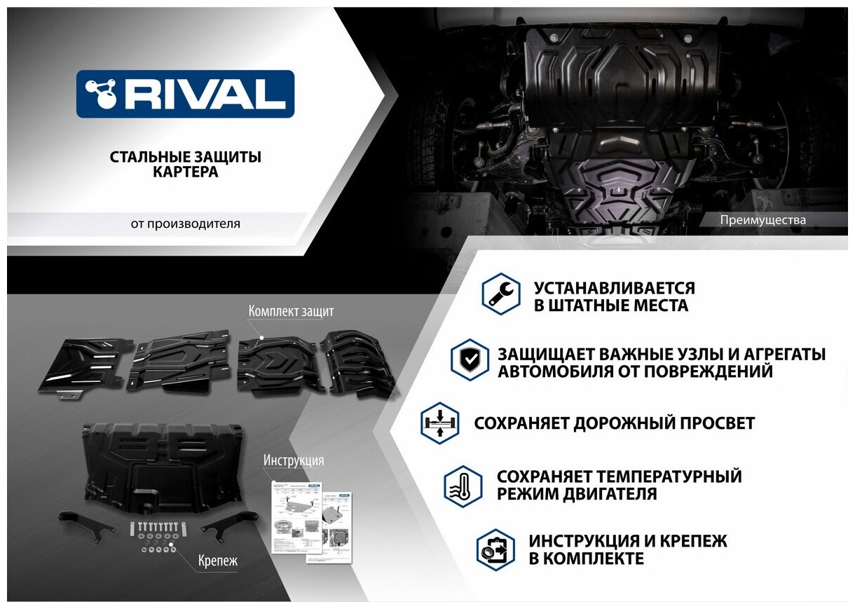 Стальные защиты картера Rival надежно защищают днище вашего автомобиля от повреждений при наезде на бордюры, выступающие канализационные люки, кромки поврежденного асфальта или при ремонте дорог, не говоря уже о загородных дорогах.