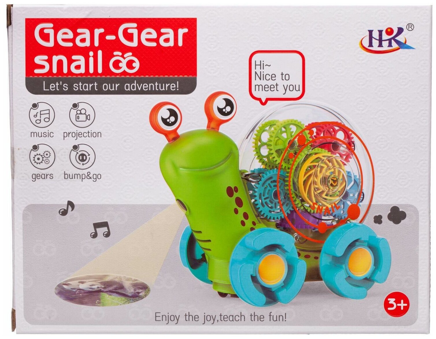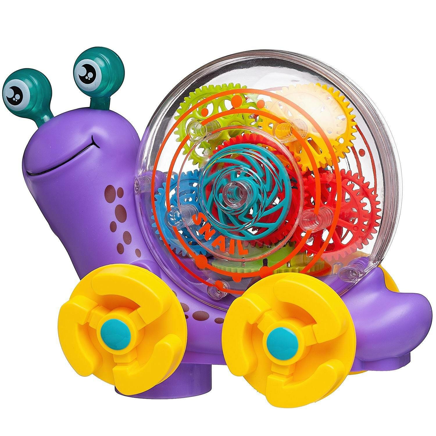 Очаровательная симпатичная, интерактивная Улитка от бренда Junfa покорит сердце любого ребенка с первого взгляда. Улитка выполнена в ярком дизайне, имеет характерные круглые глаза, прозрачную раковину с размещенными внутри разноцветными шестеренками. Улитка может плавно двигаться в любом направлении, меняя его всякий раз при столкновении с препятствием на пути. Во время движения будет работать яркая подсветка внутри прозрачного корпуса и глаз, шестерёнки будут вращаться под звуки мелодичной песни на английском языке. В переднюю часть корпуса встроен проектор, демонстрирующий картинку с животным. Игра с ней обязательно будет интересной и увлекательной, особенно в темном помещении.