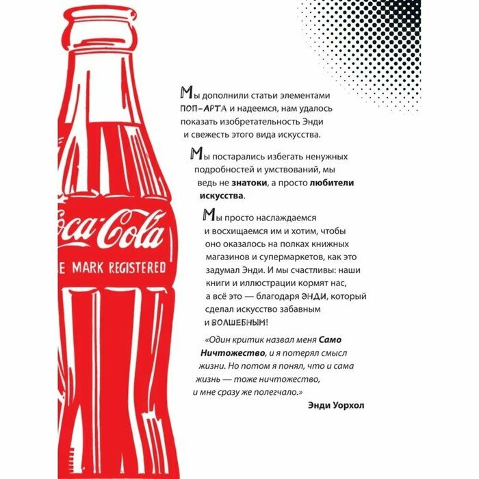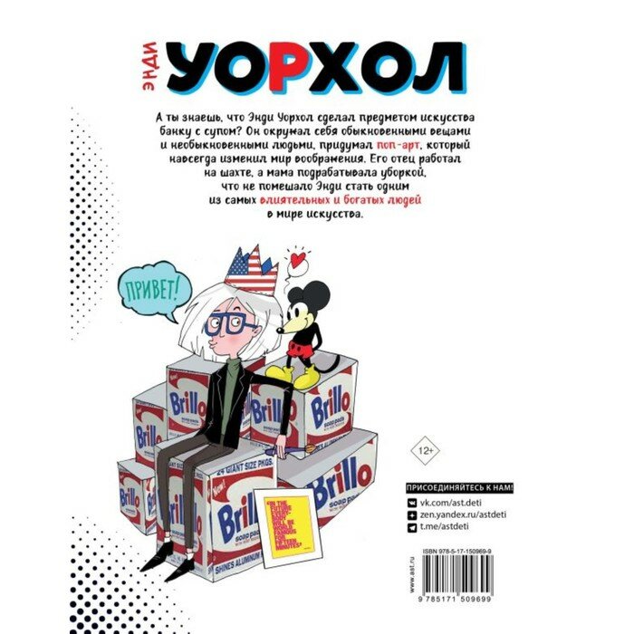 Брала в подарок для племянника. Яркая и интересная книжка, отличный способ для ребенка-школьника познакомиться с жизнью и творчеством художника и получить первые представления о таком стиле как поп-арт. Легкий и интересный текст прекрасно дополняет большое количество фотографий и иллюстраций. Как итог: ребенок рад и еще больше заинтересовался темой искусства.