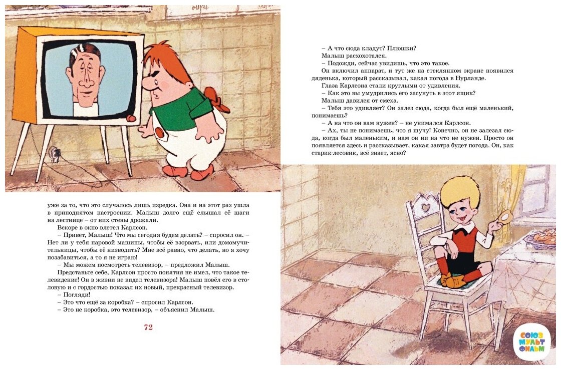 Яркие, знакомые с детства образы фрёкен Бок, Малыша и Карлсона, которые создал для мультфильмов художник Анатолий Савченко, прекрасно дополняют любимую детьми и взрослыми сказочную историю Линдгрен.