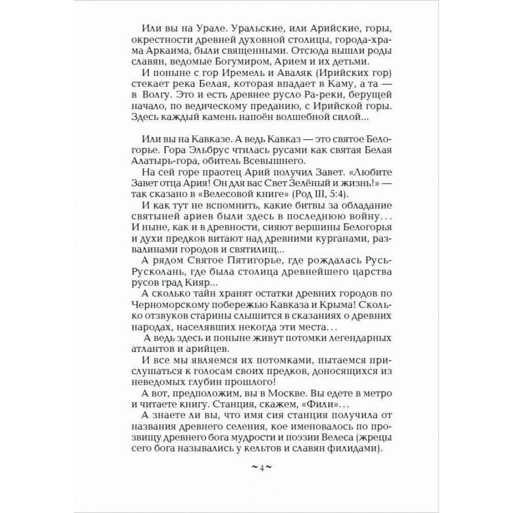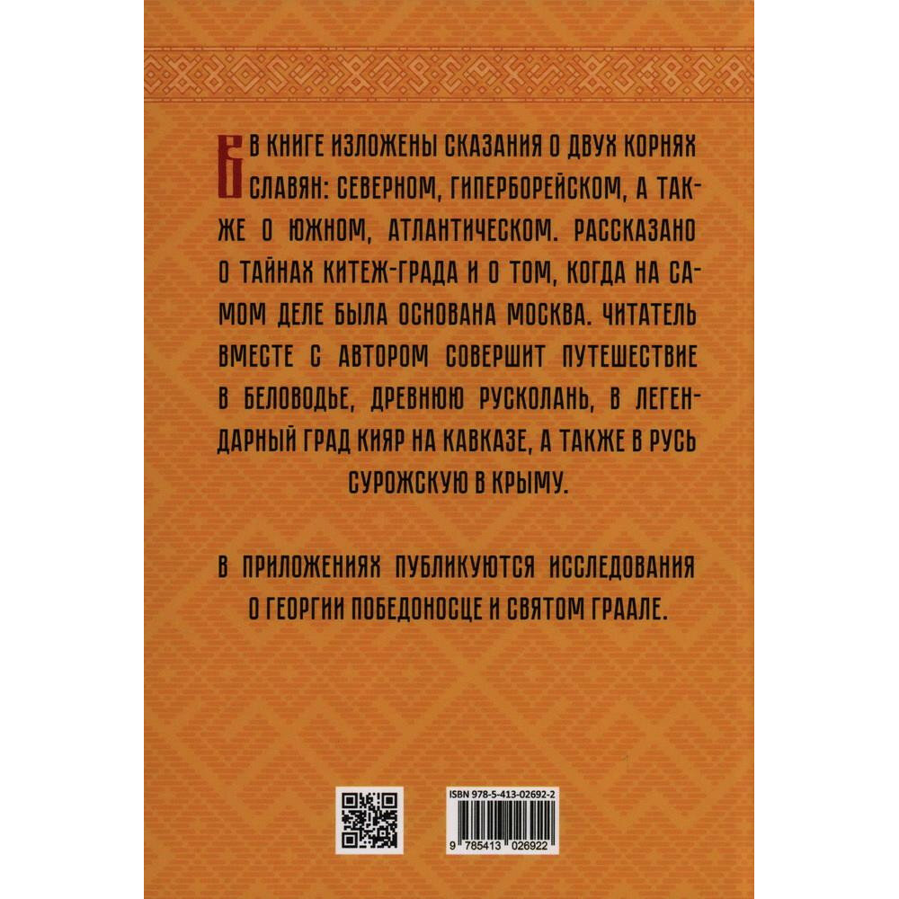 В книге изложены сказания о двух корнях славян: северном, гиперборейском, также о южном, атлантическом. Рассказано о тайнах Китеж-града и о том, когда на самом деле была основана Москва. Читатель вместе с автором совершит путешествие в Беловодье, Древнюю Русколань, в легендарный град Кияр на Кавказе, а также в Русь Сурожскую в Крыму.