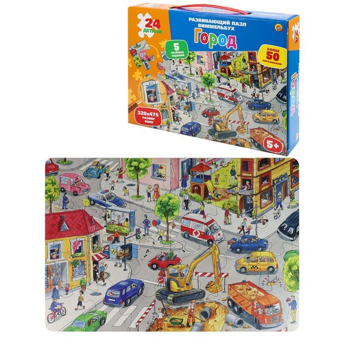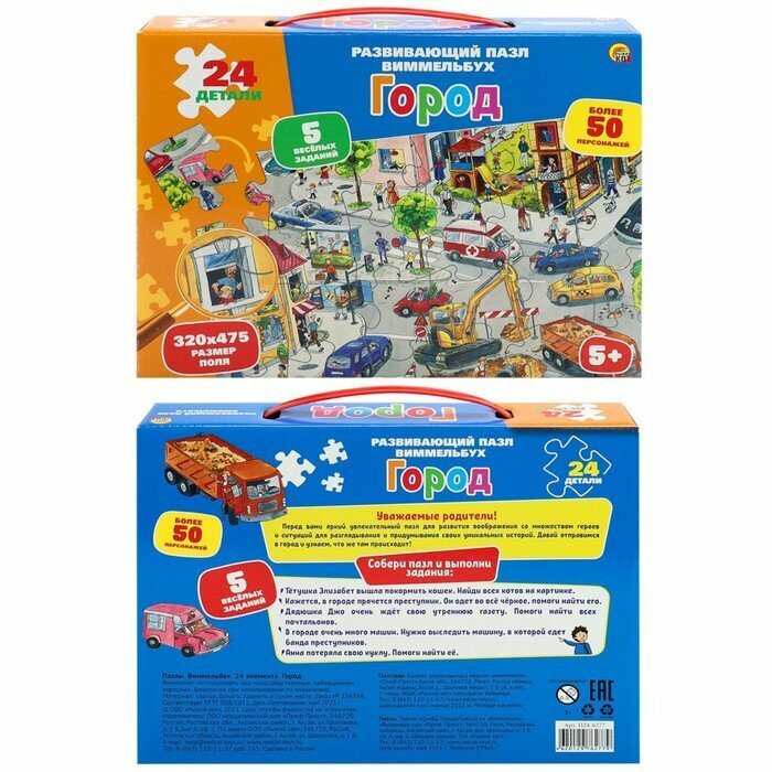 Виммельбух - пазл с детализированными, насыщенными визуальной информацией иллюстрациями. Герои одновременно оказываются в различных забавных ситуациях - это даёт возможность ребёнку каждый раз по-новому воспринимать картинки и придумывать новые истории. Основное назначение такого пазла - ознакомление с окружающим миром, развитие речи, воображения и мелкой моторики.