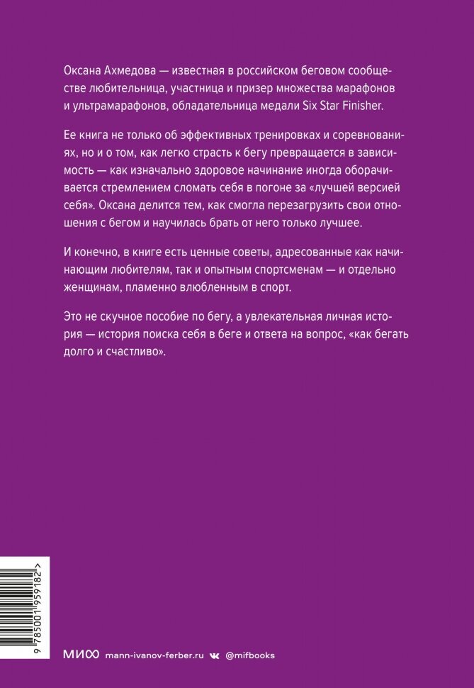 Ее книга не только об эффективных тренировках и соревнованиях, но и о том, как легко страсть к бегу превращается в зависимость - как изначально здоровое начинание иногда оборачивается стремлением сломать себя в погоне за "лучшей версией себя". Оксана смогла перезагрузить свои отношения с бегом и научилась брать от него только лучшее.