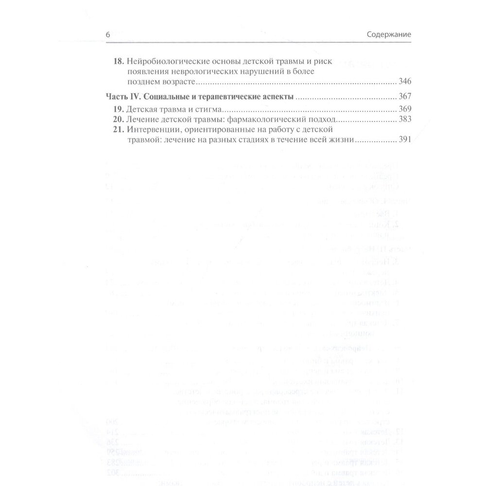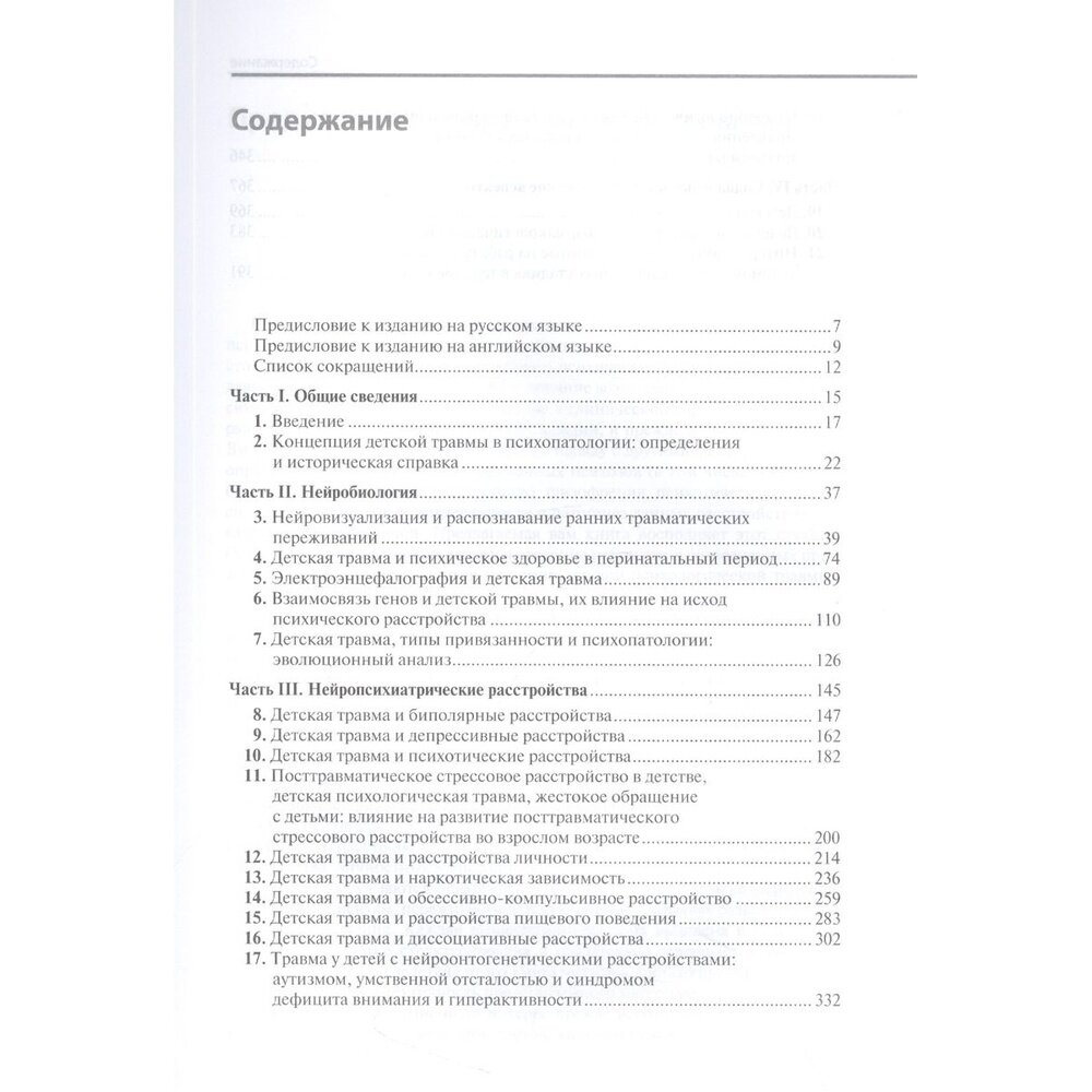 В книге представлен исчерпывающий исторический очерк по изучению проблемы детской психологической травмы и ее роли в развитии психических заболеваний, а также приведены данные, касающиеся современных нейробиологических маркеров: нейровизуализационные находки, электроэнцефалографические изменения, взаимосвязь этих данных с результатами генетических и эволюционных исследований. Оценивается роль детских травмирующих событий в развитии отдельных эндогенных психических заболеваний, а также посттравматического стрессового расстройства, расстройств пищевого поведения, обсессивно-компульсивного расстройства, личностных и диссоциативных нарушений. Отдельно обсуждаются психотерапевтические и психофармакологические подходы к пациентам, пережившим детскую травму, у которых развились психические нарушения.