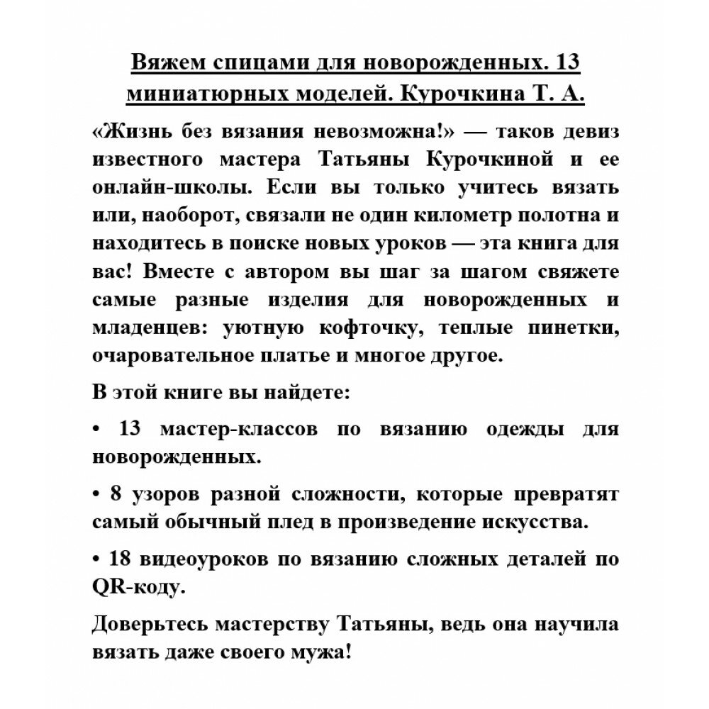 "Жизнь без вязания невозможна!" - таков девиз известного мастера Татьяны Курочкиной и ее онлайн-школы. Если вы только учитесь вязать или, наоборот, связали не один километр полотна и находитесь в поиске новых уроков - эта книга для вас! Вместе с автором вы шаг за шагом свяжете самые разные изделия для новорожденных и младенцев: уютную кофточку, теплые пинетки, очаровательное платье и многое другое.