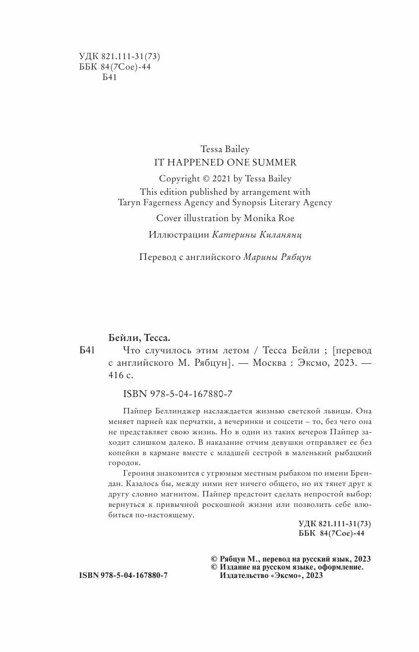 Идеальная книга для поклонников романов Анны Тодд, Елены Армас и Али Хейзелвуд! Тесса Бейли — королева горячих романов. Автор невероятно счастлива, что ей удалось воплотить в жизнь свою мечту — писать о влюбленных людях. Бестселлер Сети! Более 344 000 000 просмотров в TikTok! Пайпер Беллинджер наслаждается жизнью светской львицы. Она меняет парней, как перчатки, а вечеринки и соцсети — то, без чего она не представляет свою жизнь. Но в один из таких вечеров Пайпер заходит слишком далеко. В наказание отчим девушки отправляет ее без копейки в кармане вместе с младшей сестрой в маленький рыбацкий городок. Героиня знакомится с угрюмым местным рыбаком по имени Брендан. Казалось бы, между ними нет ничего общего, но их тянет друг к другу словно магнитом. Пайпер предстоит сделать непростой выбор: вернуться к привычной роскошной жизни или позволить себе влюбиться по-настоящему. «Избалованная тусовщица из Лос-Анджелеса приезжает в маленький рыбацкий городок — комичное начало большого приключения, которое будет приправлено юмором, душевностью, страстью и атмосферными видами океана. Цель любой романтической книги в конечном счете — влюбить нас в потрясающего книжного мужика и пережить с ним головокружительный роман (через ощущения и чувства героини, конечно), с чем эта история успешно справляется: на протяжении всего сюжета я сидела с улыбкой влюбленной дурочки и огромными сердечками в глазах, а закрыла книгу с ощущением парения над землей!» — Лена Сокол, писательница "Что случилось этим летом" — не просто легкий роман, который вам захочется взять с собой в отпуск. Эта книга о том, как внезапно вспыхнувшее чувство может перевернуть все с ног на голову, не оставив шанса на сопротивление. Именно это и произошло с главной героиней. Приехав в город своего детства, она вдруг обретает не только любовь всей жизни, но и себя настоящую. По ходу развития сюжета мы видим, как из-под глянцевой мишуры постепенно начинает проявляться истинная Пайпер: эмоциональная, искренняя, страстная и любящая. Ее больше не пугают перемены и сложности, потому что теперь есть за что бороться и на кого опереться. И какие бы высокие волны ни ждали ее в этом большом плавании, теперь рядом всегда будет Брендан — капитан ее сердца и личная станция подзарядки». — Юлия Серикова, шеф-редактор сайта Wday. ru «Если вы любите романы, но устали от абьюзивных взаимоотношений и наигранной драмы, то эта взрослая история вам необходима, как глоток свежего воздуха! Столько нежности. Внутренней борьбы. Животной страсти. Я в невероятном восторге». — @oh_pollybooks «Я осталась в полном восторге, как от персонажей, так и сюжета в целом! Книга вышла яркой, романтичной и заражающей позитивными эмоциями. Ты не можешь сдержать эмоции, будь то смех или грусть, и это чудесно!» — @for_books_ever «Благодаря своему исключительному таланту Бейли удается сочетать романтику и химию между главными героями. Это одновременно сладко и взрывоопасно сексуально». — Кейт Клейборн, автор бестселлера «Любовь с первого взгляда» «Страстный, сексуальный и веселый роман». — New York Post