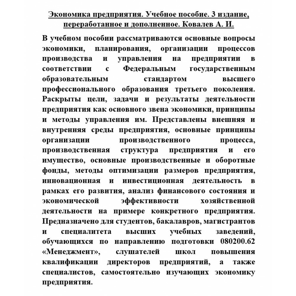 Предназначено для студентов, бакалавров, магистрантов и специалитета высших учебных заведений, обучающихся по направлению подготовки 080200.62 "Менеджмент", слушателей школ повышения квалификации директоров предприятий, а также специалистов, самостоятельно изучающих экономику предприятия.
