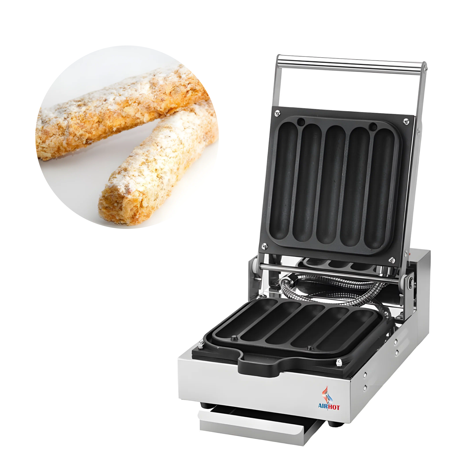 Вафельница Airhot WBS-5 используется для выпекания хрустящих вафельных палочек. Модель оснащена терморегулятором и электронным таймером. Жарочная поверхность выполнена из чугуна с антипригарным покрытием.