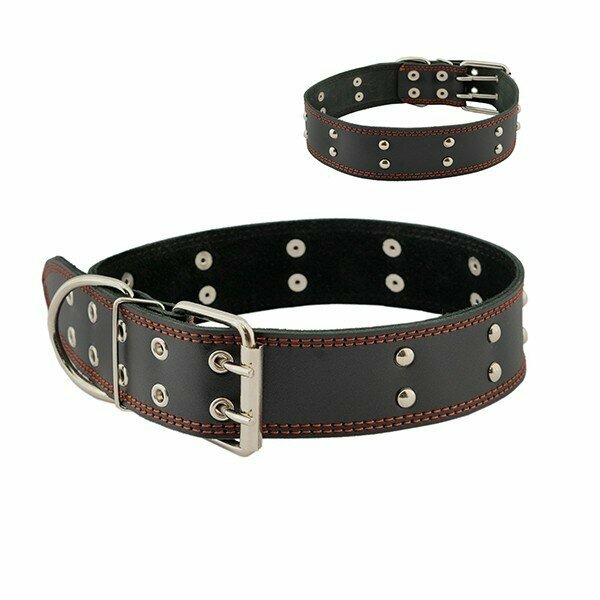 Усиленный кожаный ошейник из двух слоев натуральной кожи различной выделки с декоративной отстрочкой прочной нитью, и украшенный рядом металлических заклёпок. Отверстия для регулировки длины усилены металлическими блочками. Для крепления поводка установлено надежное никелированное полукольцо сварной конструкции.