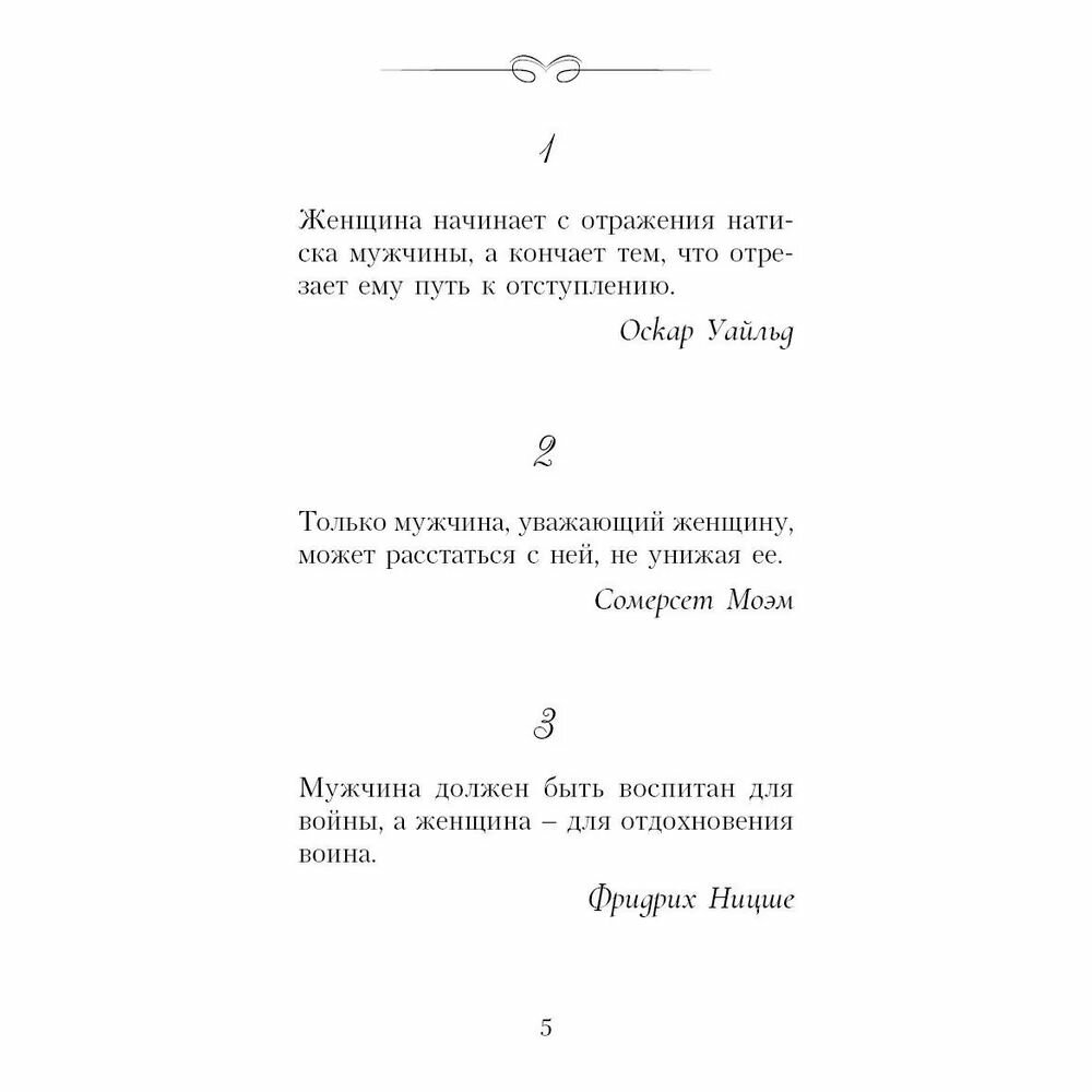 В этой книге собраны жемчужины человеческой мудрости, восхищающие ювелирной тонкостью ума и изяществом словесного искусства. Изречения великих мудрецов, меткие пословицы, юмористические цитаты и фразы известных писателей, поэтов, артистов, обращенные в первую очередь к женщинам, у кого-то вызовут улыбку, кого-то взволнуют, настроят на глубокие раздумья и заставят по-новому взглянуть друг на друга. Хочется верить, что эта книга принесет пользу и доставит удовольствие всем читателям.
