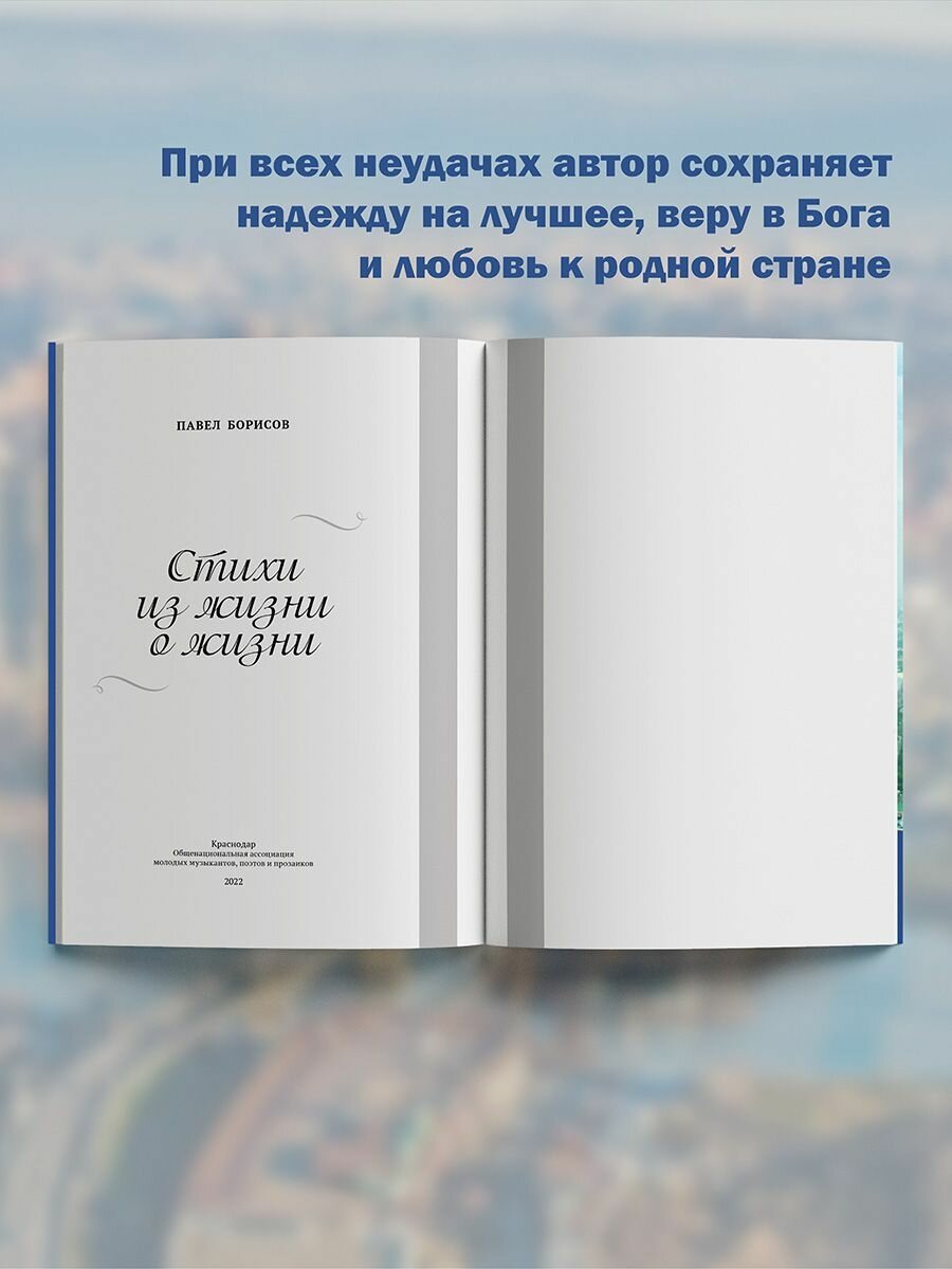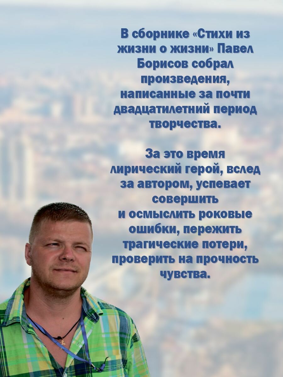 В сборнике "Стихи из жизни о жизни" Павел Борисов собрал произведения, написанные за почти двадцатилетний период творчества. За это время лирический герой, вслед за автором, успевает совершить и осмыслить роковые ошибки, пережить трагические потери, проверить на прочность чувства.