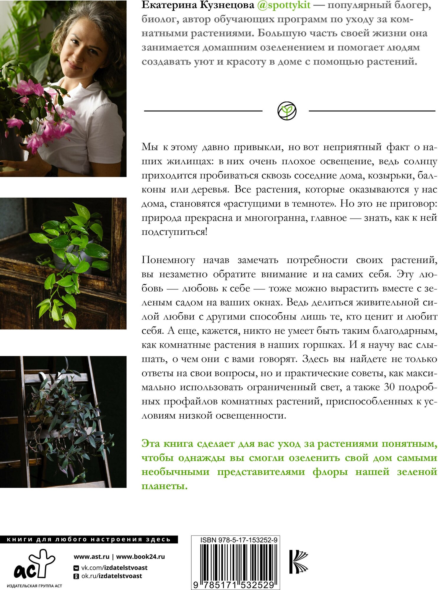 Понемногу начав замечать потребности своих растений, вы незаметно обратите внимание и на самих себя. Эту любовь - любовь к себе - тоже можно вырастить вместе с зеленым садом на ваших окнах. Ведь делиться живительной силой любви с другими способны лишь те, кто ценит и любит себя. А еще, кажется, никто не умеет быть таким благодарным, как комнатные растения в наших горшках. И я научу вас слышать, о чем они с вами говорят. Здесь вы найдете не только ответы на свои вопросы, но и практические советы, как максимально использовать ограниченный свет, а также 30 подробных профайлов комнатных растений, приспособленных к условиям низкой освещенности.