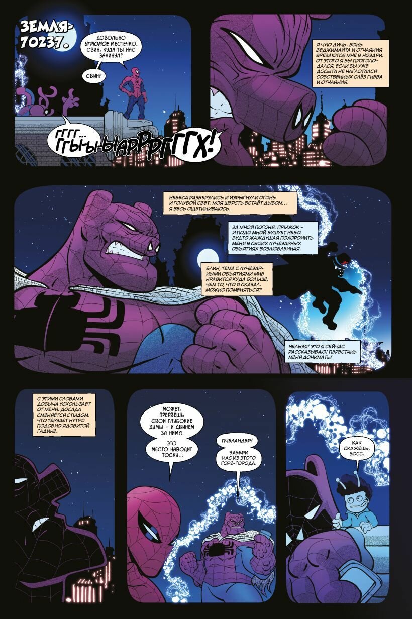 После славных похождений Свина-Паука по паучьим мирам в жизни Питера начались тихие деньки. Но им не суждено было долго продлиться, - Свин застолбил за собой право на все межпространственные приключения, а тут как раз одно такое намечается! Родному миру Свина угрожает хрюкокалипсис, и без помощи Человека-Паука тут будет явно не обойтись!