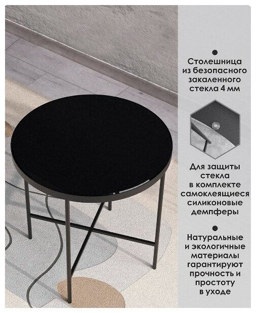Журнальный столик выполнен в современном стиле, сочетающем оригинальную текстуру декоративного покрытия столешницы и металлического подстолья в цвете чёрный муару. С легкостью впишется в любой интерьер. Конструкция сборная. Низ: Крестовина и ножки из круглой металлической трубы с порошковой покраской ( RAL 9005). Верх: Стекло(стемалит) толщина 4 мм. В комплект входит вся необходимая фурнитура. Идея Callisto mobile заключалась в том, чтобы спроектировать журнальный столик для современного универсального дома. Круглая форма журнального стола с легкостью впишется в любой интерьер. Столик выполнен в стиле «LOFT». Гибкость стиля вполне позволяет обновить интерьер обычного типового жилья и удачно обыграть даже некоторые недостатки квартиры. Простой и практичный дизайн этого журнального столика создает невесомый образ в помещении. Современный круглый журнальный столик подойдет для выполнения различных повседневных функций: кто-то будет использовать его, чтобы поставить мелочи вроде пепельницы, статуэтки или часов, кто-то будет использовать как приставной к дивану, кровати, чтобы поставить различные гаджеты, журнал или книгу, кто-то будет красиво его сервировать к чаепитию, а кто-то увидит в нем изысканный вариант мини-бара, таким образом столик можно использовать, как сервировочный стол. Наши столики позаботятся обо всем, что хочется держать под рукой и станет желанным подарком близким, друзьям на день рождение, на новоселье и различные праздники.